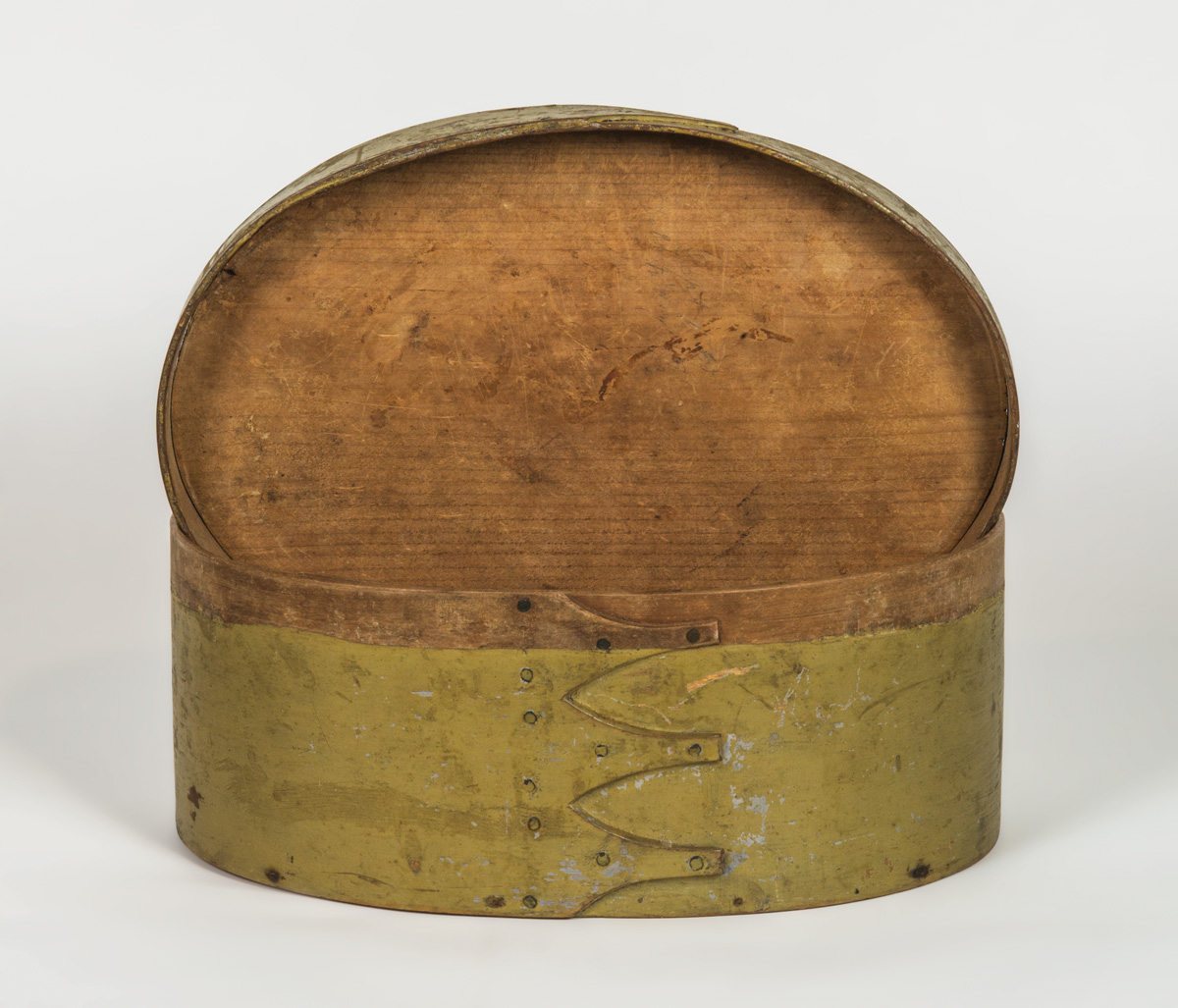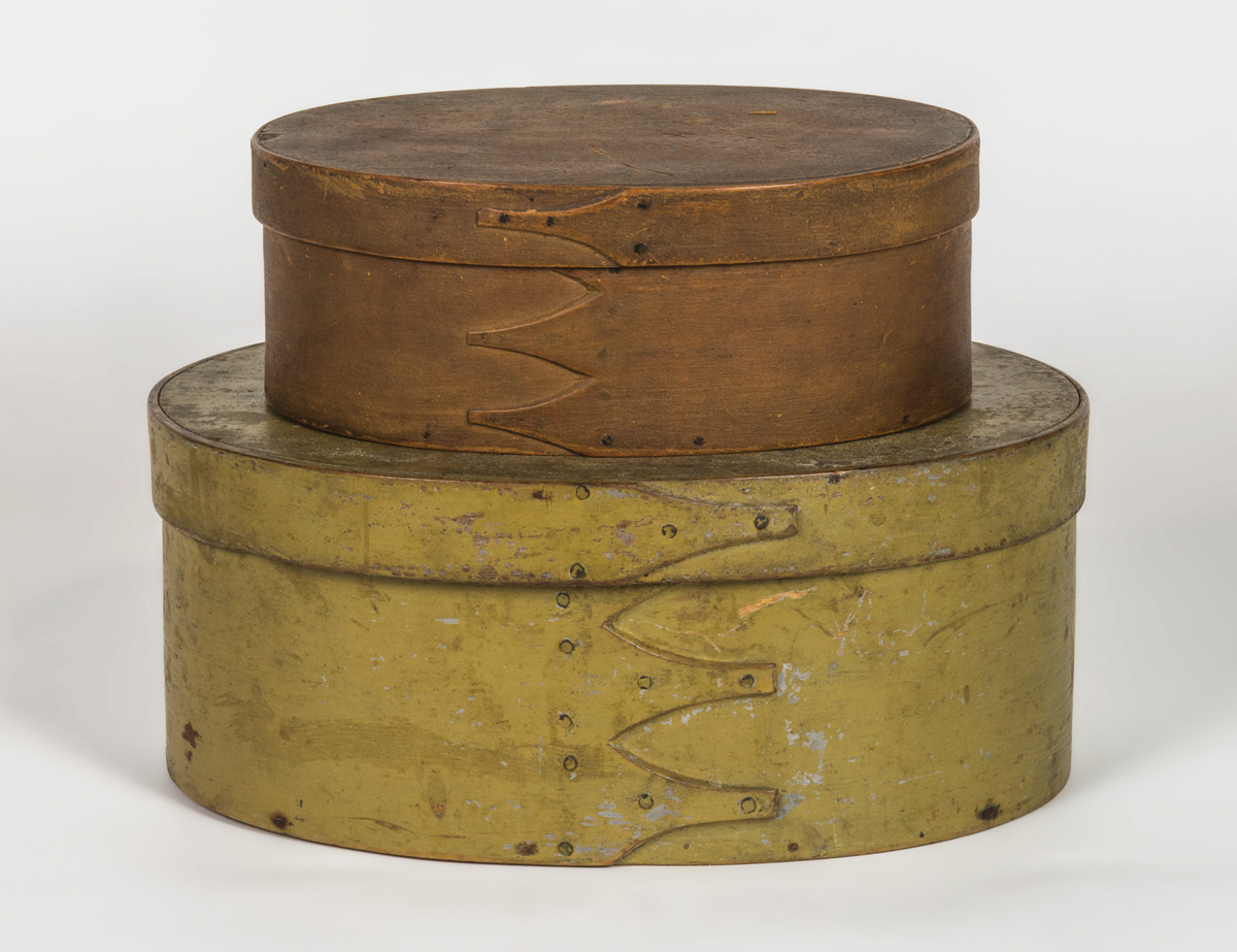 Pine and maple, original khaki brown paint, four fingers right to left, overall good condition, 3 1/4″ h, 8 3/4″ l; Pine and maple, early Shaker light green over light blue, four fingers, Sabbathday Lake or Alfred, ME, c. 1850, 4 3/4″ h, 11 1/4″ l.