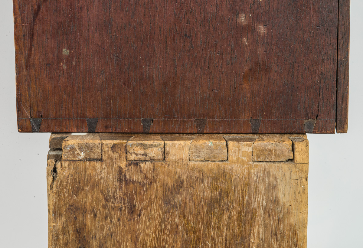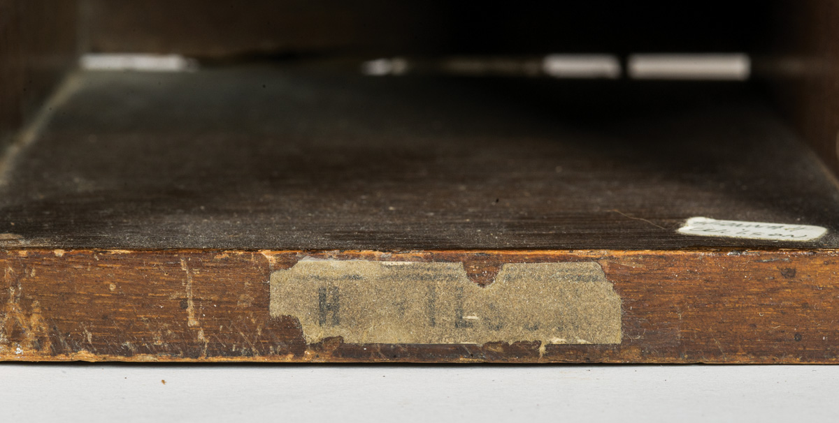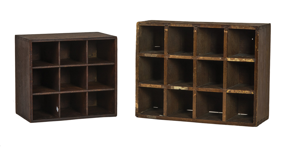 Walnut, original finish, nine section case, finely dovetailed, tagged “Trustee House, Church Family, Enfield, CT.”, 12″ h, 13 1/4″ l, 8 1/4″ d; Walnut, twelve section box, dovetailed, a few of the openings are labeled as “Kezia Lyman” and “Hannah Wilson”, Church Family, Enfield, CT, 14″ h, 16 1/2″ w, 8 1/2″ d; (ex. estate of Robert R. Sokol Sr. collection).