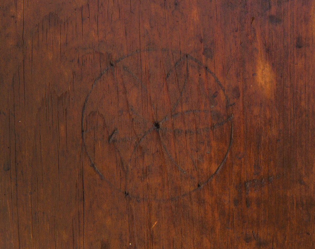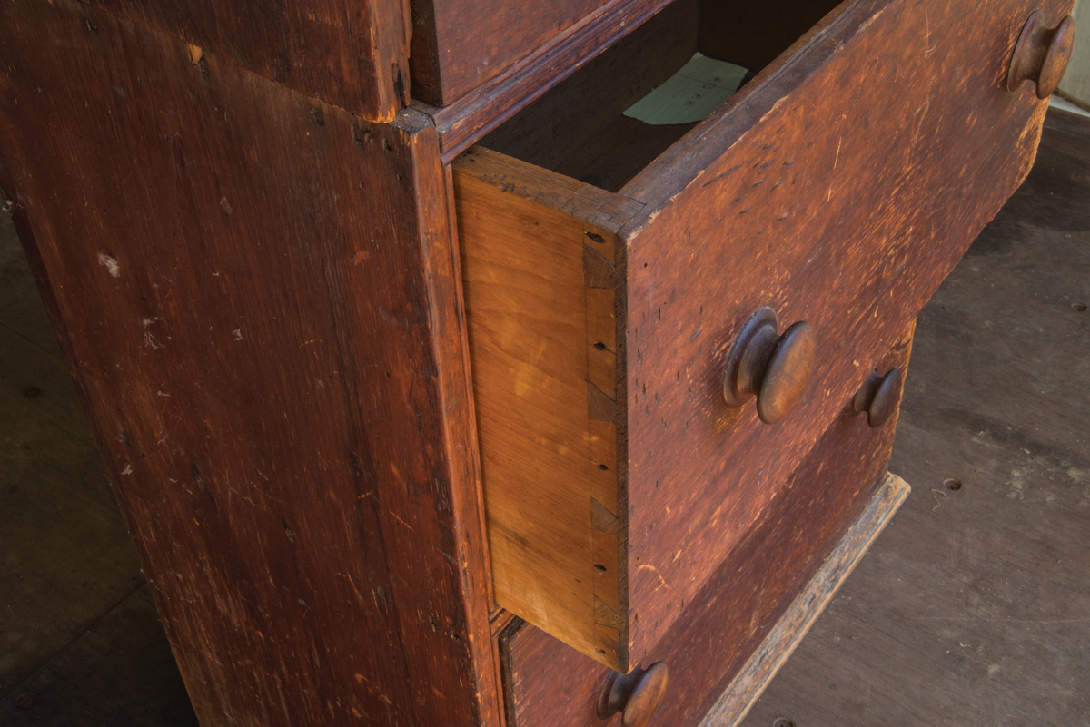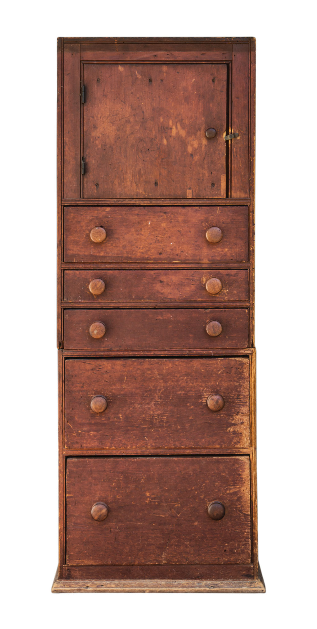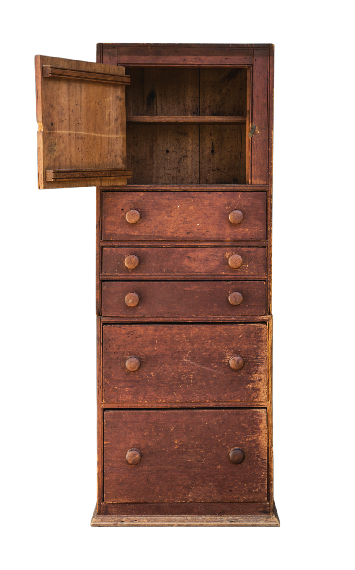 Pine, original red/brown stained finish, plank hinged door with battons secured with inset exterior screws, single recessed shelf interior, five dovetailed drawers, top three drawers are partitioned, bottom two drawers are larger and detached from top drawers, molded base, found in Acton, MA, purchased from a picker in 1978, Harvard Community Shakers, some scratches and small repairs, 5′ 5 1/2″ h, 24″ w, 13″ d, (ex. Pat Hatch collection).