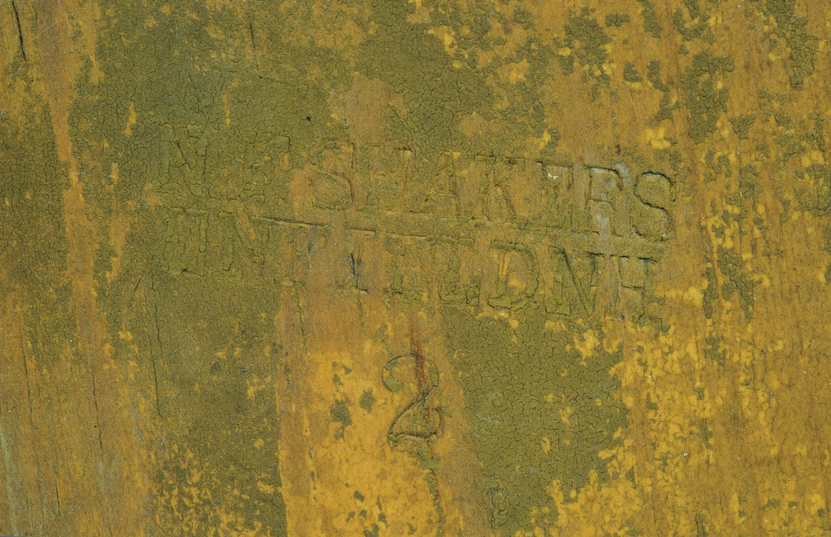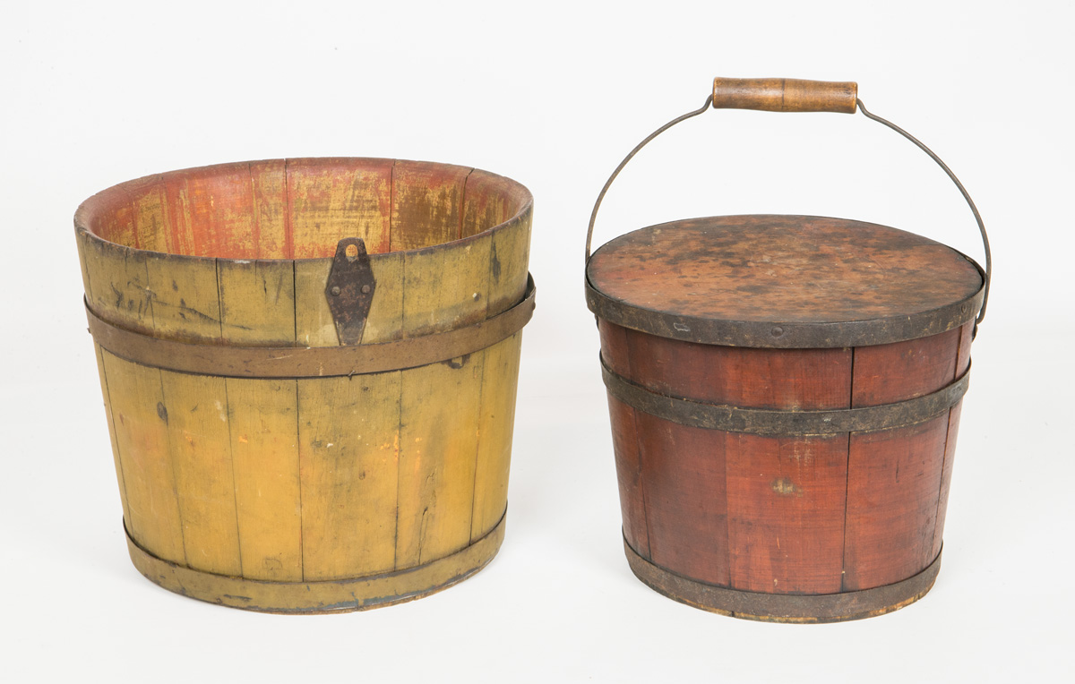 Maple sugar pail, pine, original yellow painted exterior and red interior, two iron bands, stamped on bottom “N.F. Shakers, Enfield, NH, 2″, 9 1/2″ h, 11 3/4” dia; Lidded utility pail, pine, original cranberry red painted finish, wire swing handle with turned maple grip, diamond shaped escutcheon, stamped on bottom “N.F. Shakers, Enfield, NH”, 8″ h (to rim), 10″ dia; (ex. Pat Hatch collection).