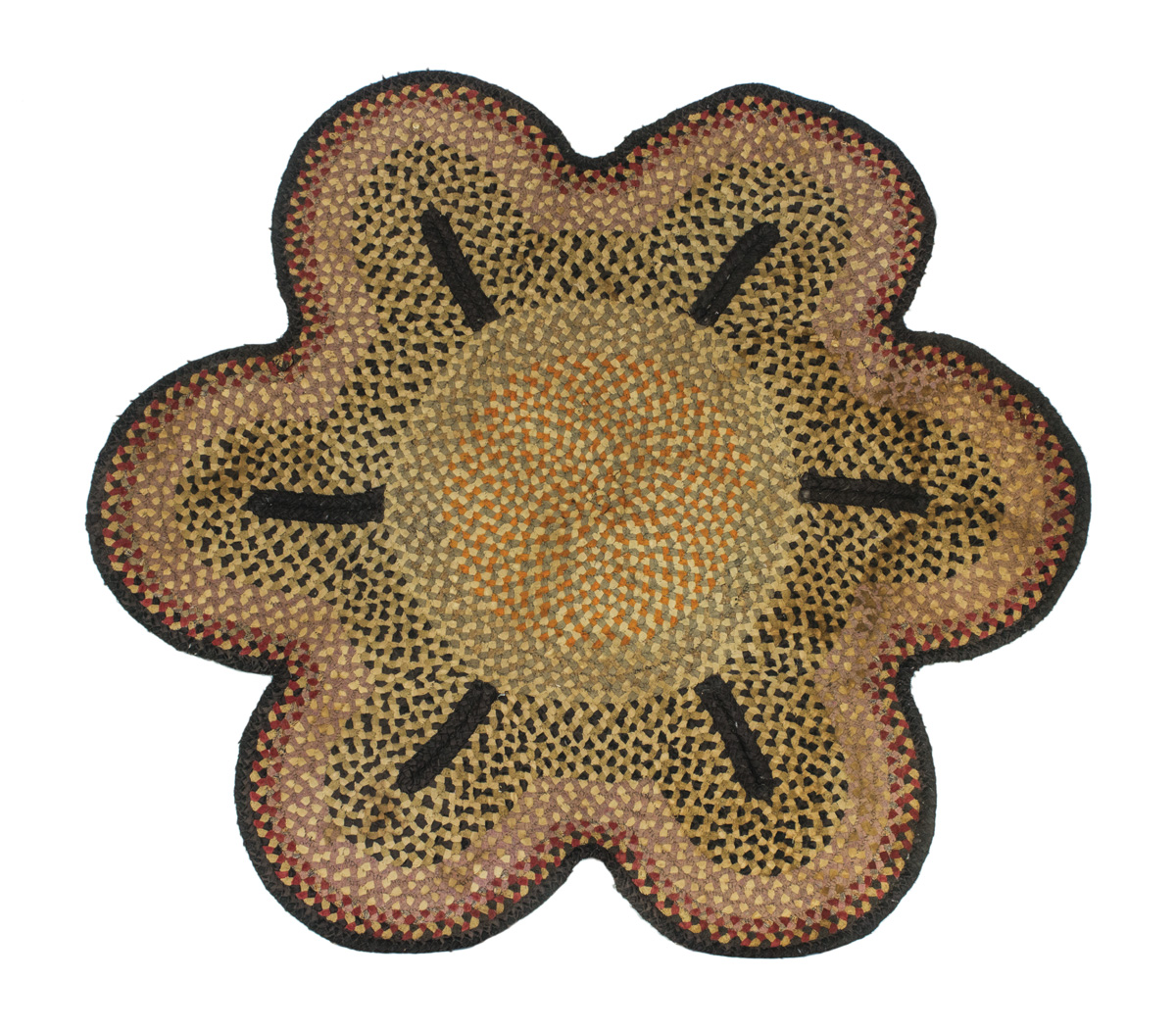 Spoke wheel design, hexagonal scalloped edge, bound in black braid, light brown, cream, grays and red, some minor stains and lightly faded, overall good condition, tagged “Hancock Shaker Rug, Estelle”, 41″ dia, (ex. Pat Hatch collection).