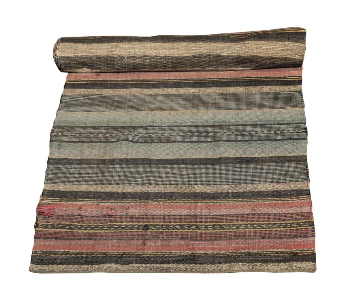 Half stripe and half random multicolor, reds, yellow, blues and black, some minor repairs, overall good condition, 17′ 8″ l, 34 1/2″ w.
