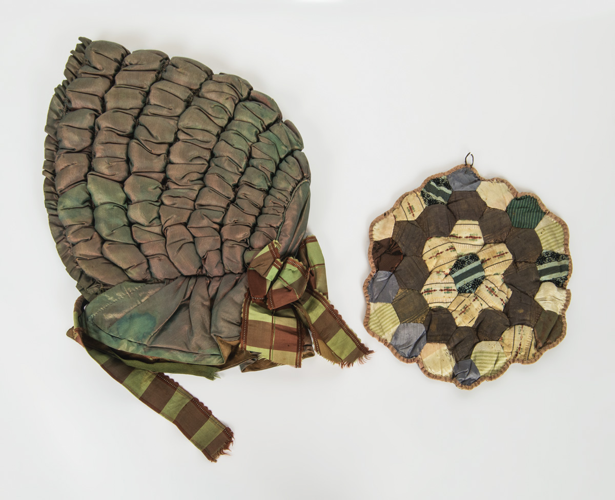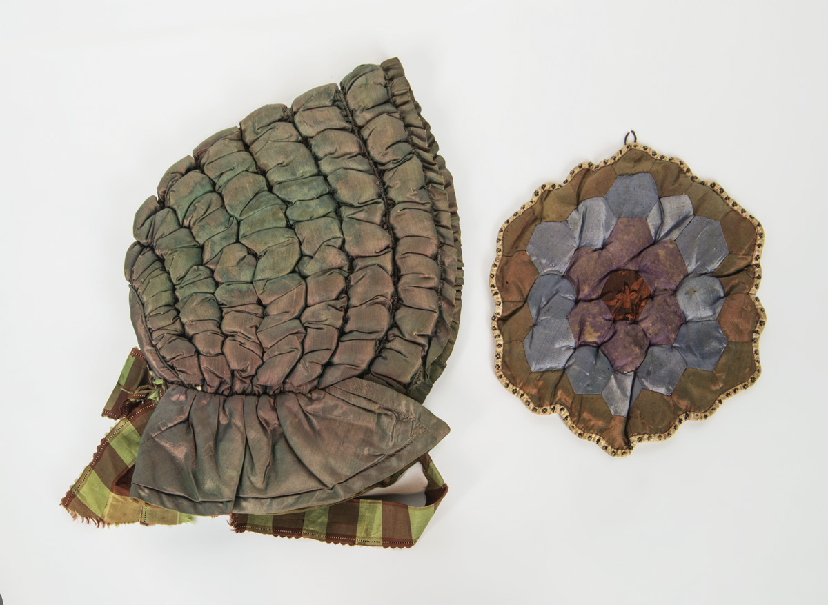 Iridescent brown and gray silk, quilted bonnet, down filled with multicolor silk ties; Sister’s quilted jacket, with red and white polka dot interior; Quilted pot holder in brown and gray; (ex. Pat Hatch collection).