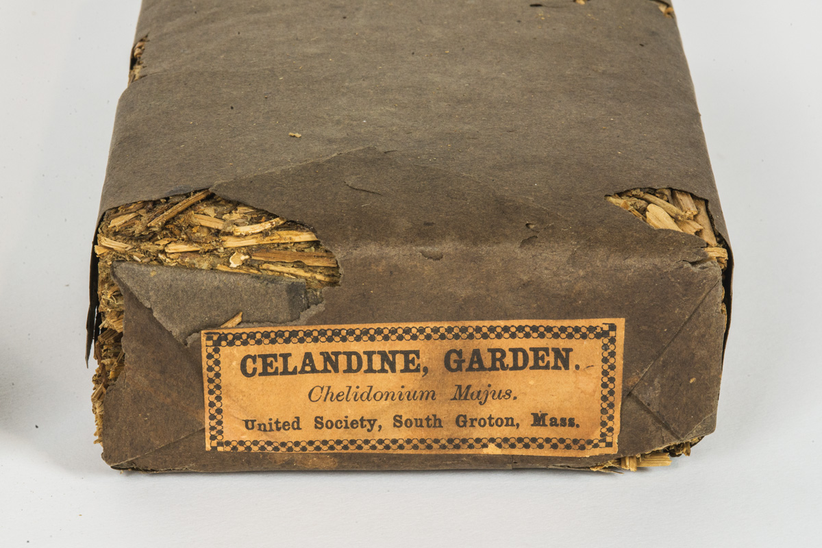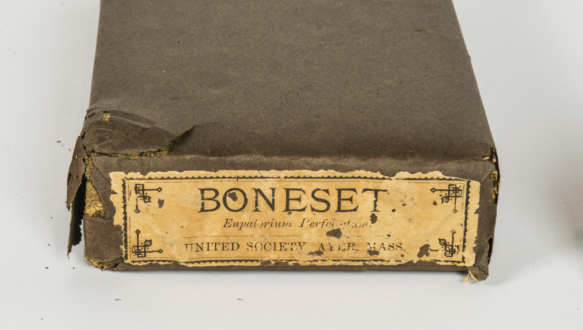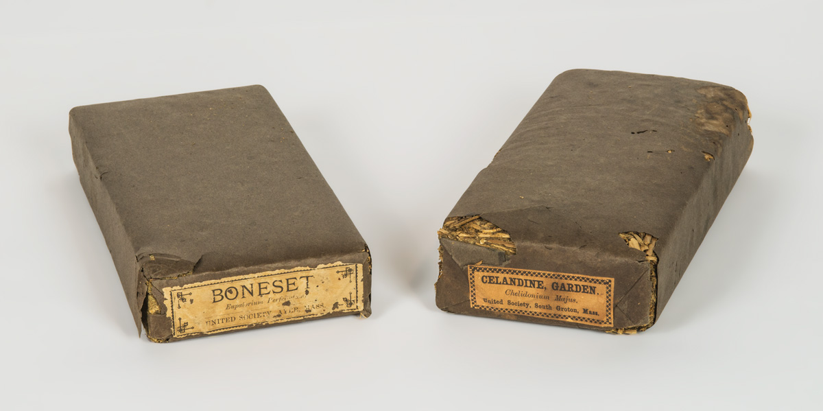 Pressed and wrapped in brown paper, and labeled “Boneset,…United Society Ayer, Mass.”, and “Celandine Garden,…United Society, South Groton, Mass.”, 1 3/4″ h, 8 1/4″ l, 4″ w, (ex. Pat Hatch collection).