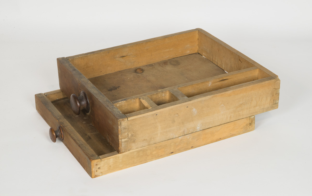Pine, traces of original blue stained finish over red, two dovetailed drawers, larger top drawer has three sections, possibly for ink and pens, above a shallow smaller drawer, both with walnut turned pulls, mortised and pegged, square tapered legs, Harvard Shakers, c. 1850, 29″ h, 19 1/2″ w, 19″ d, (ex. Ed Case, Harvard, MA; ex. Pat Hatch collection).