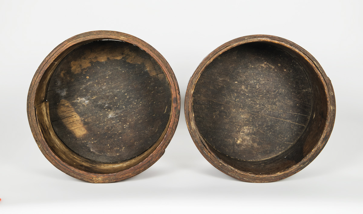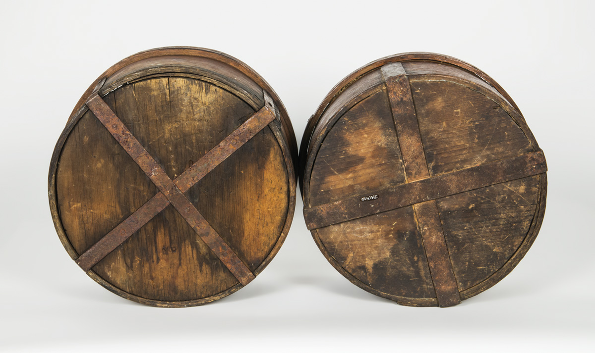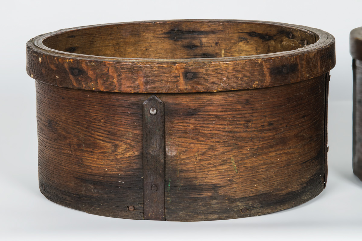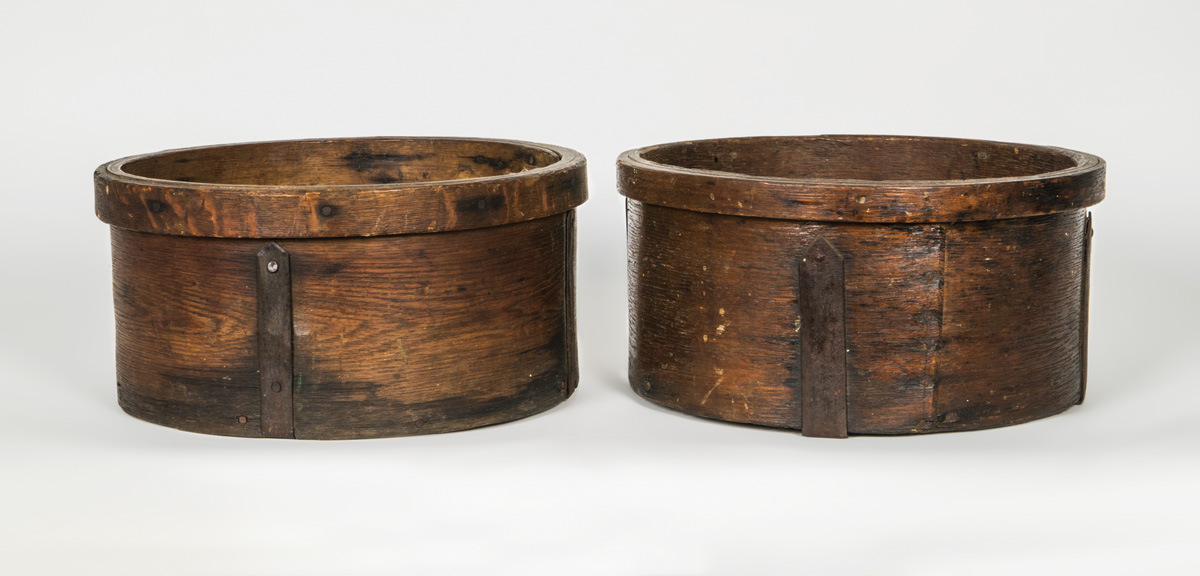 Oak with shaped strap iron reinforcements, wrapped rim, one stamped “ND” (Nathaniel Draper, first Trustee of Enfield, NH, served 1793-1838), 6″ h, 12 1/2″ dia.