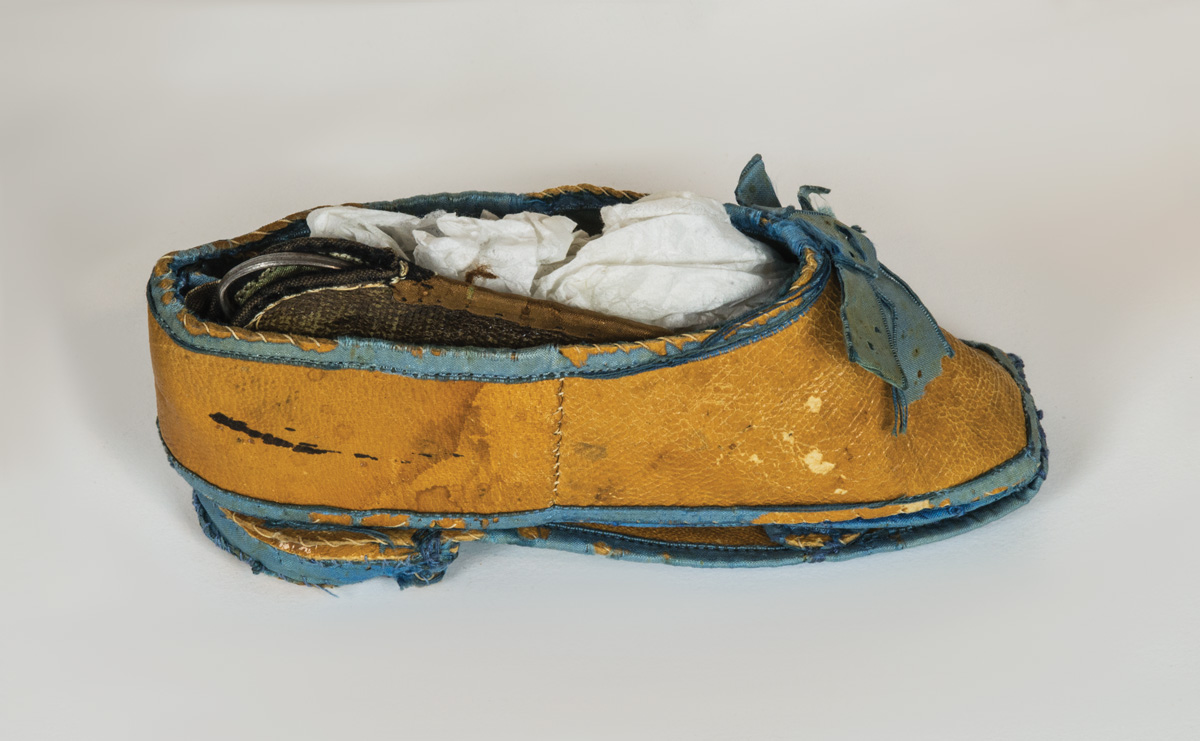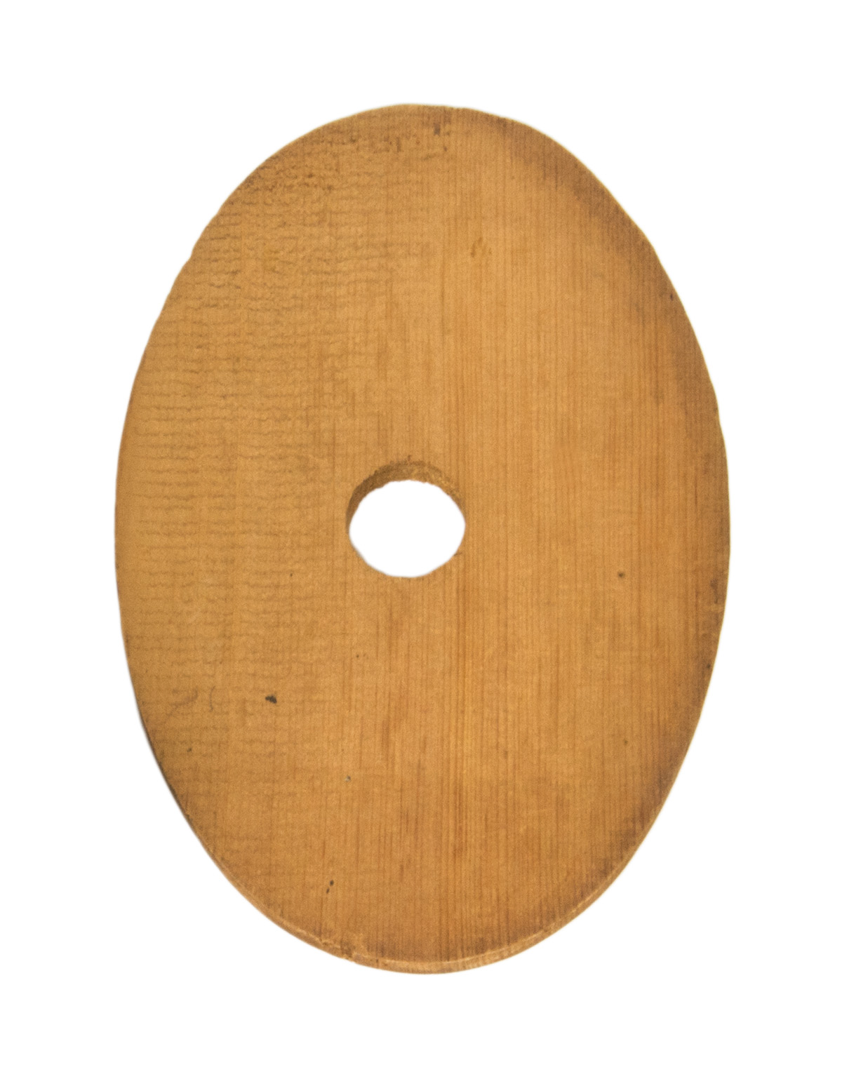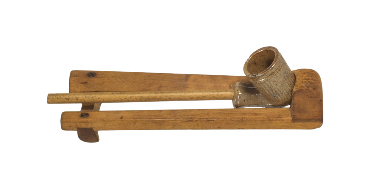 Carved clay pipe holder with pipe, maple, top is grooved for a match strike, c. 1840, 6 1/2″ l; Sister’s sewing shoe, leather and blue silk, “Fancy Goods”, interior holds scissors and thimble, bottom holds needles, and heel is stuffed to hold pins, 5″ l; Oval pine template, with circular hole for shaping oval box lids and bases, 9 1/2″ l; (ex. Pat Hatch collection).