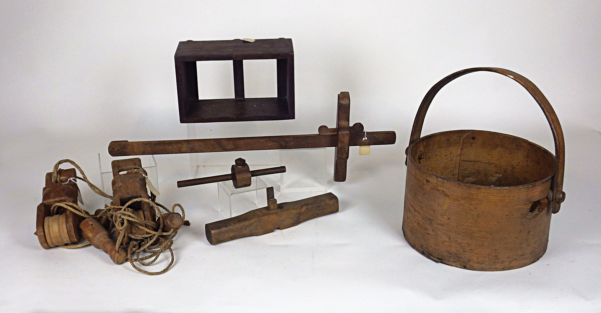 Large collection of Sister’s sewing tools and Brother’s woodworking tools from Enfield, CT, to include four oval boxes (sans lids) with threaded pegs, spools, darning eggs, etc., approximately 50 pieces, many of them tagged with families from Enfield, CT, and a walnut blind dovetailed “Millers Measure Box”, 5″ h, 9 1/2″ l; Wood scribe from “North Family”; Gouge, carved maple, marked “CF”; Shaker carved pulleys with original handmade rope, tagged “from Seed House, Church Family”; Another walnut scribe, marked “Enfield Ct. Shakers”, with threaded tightener; Swing handled measure, oak, (hole in one side), 6 1/2″ h, 11″ dia; (ex. estate of Robert R. Sokol Sr. collection).