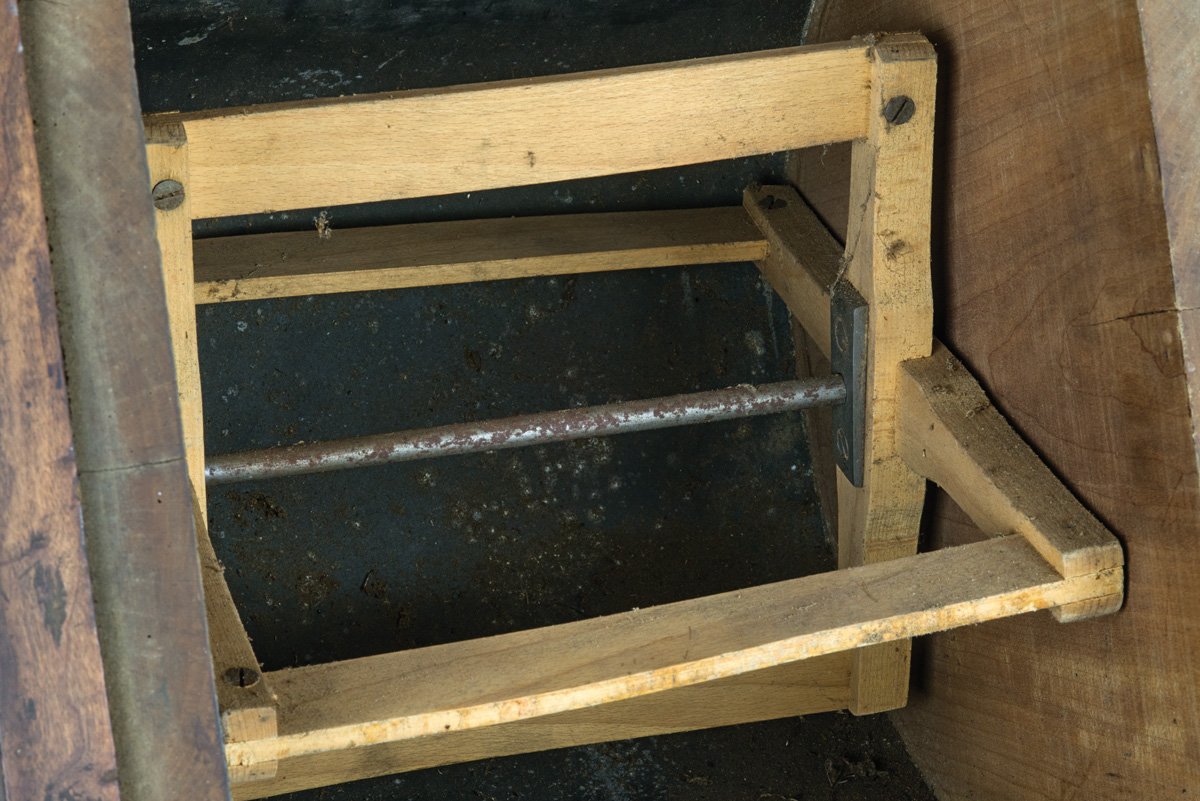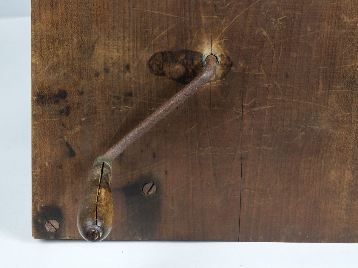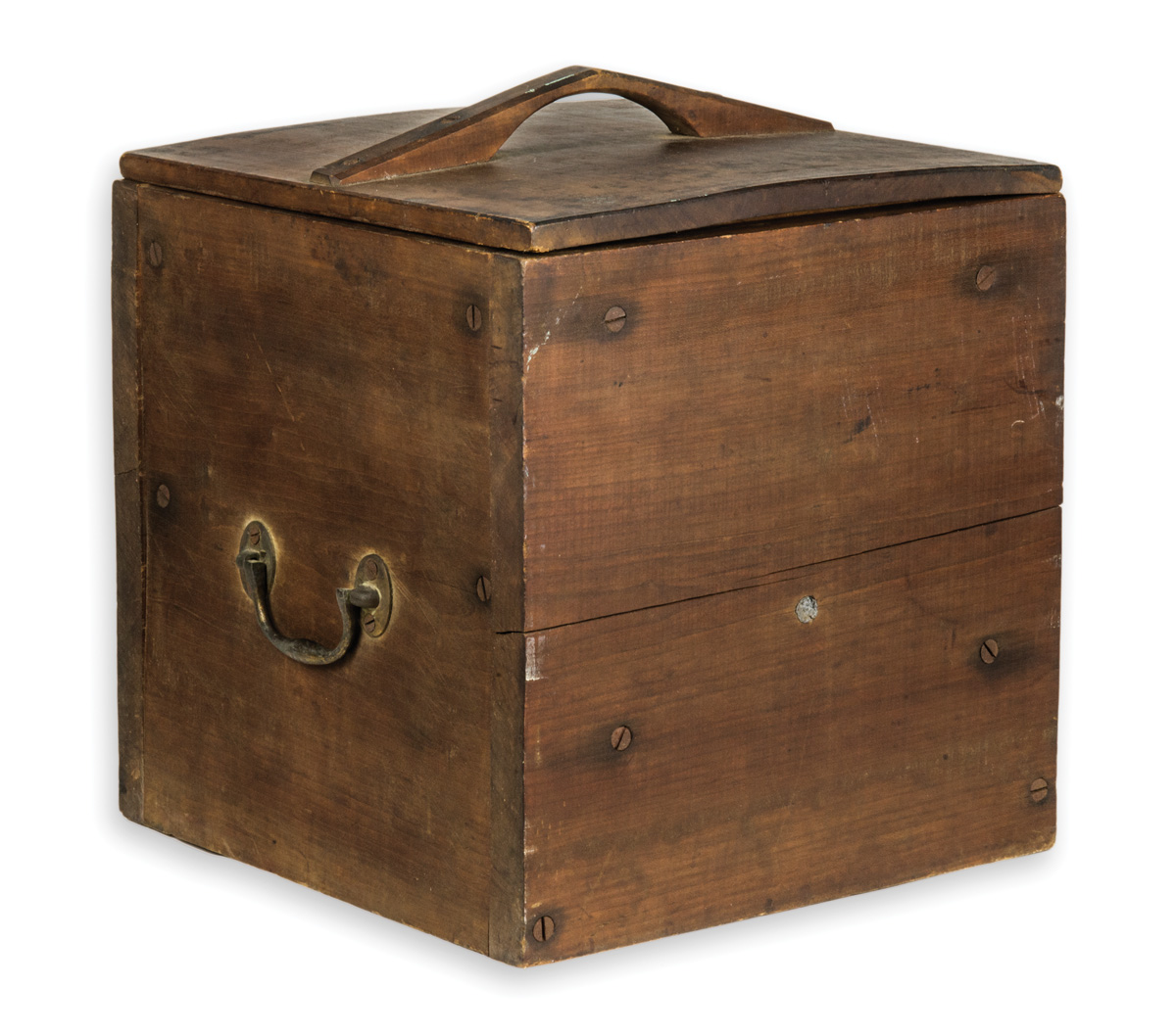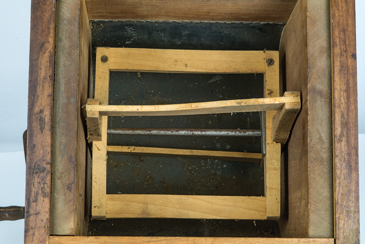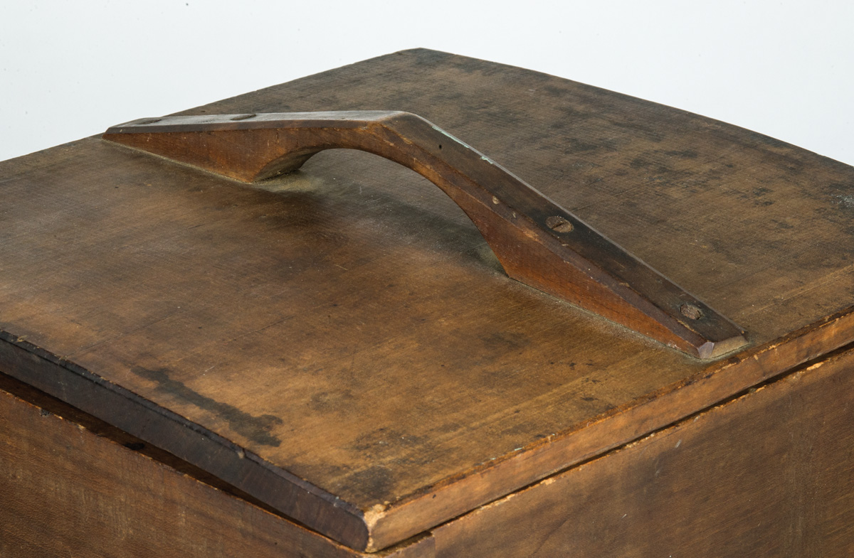 Cherry wood, natural finish and color, handled lid, paddle wheel interior with curved tin bottom, turned maple handle with cast iron spinner, brass side handles, 13 1/2″ h, 12 1/2″ x 13″ lid.