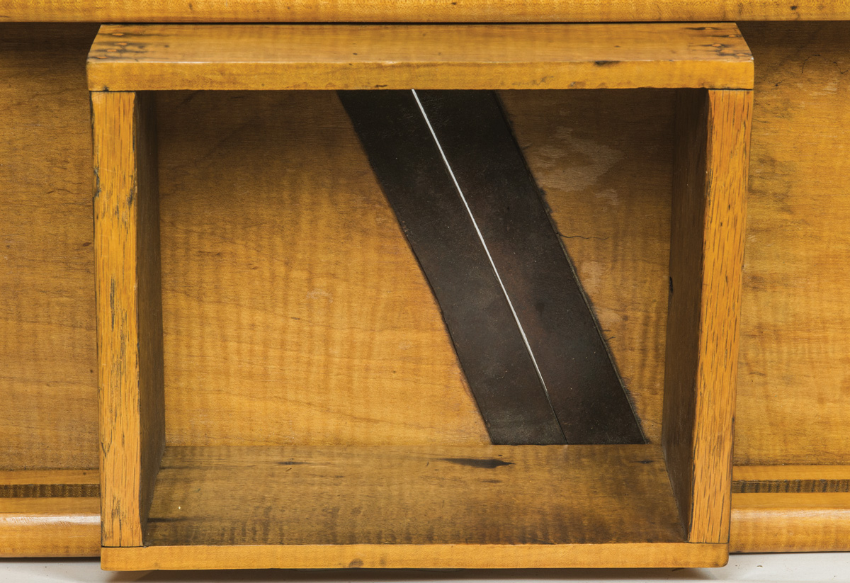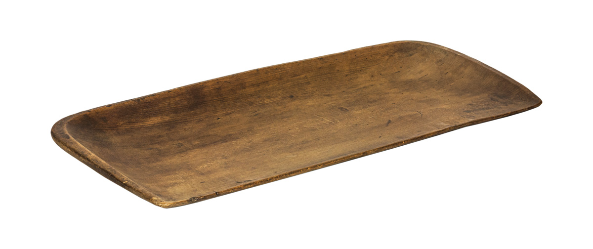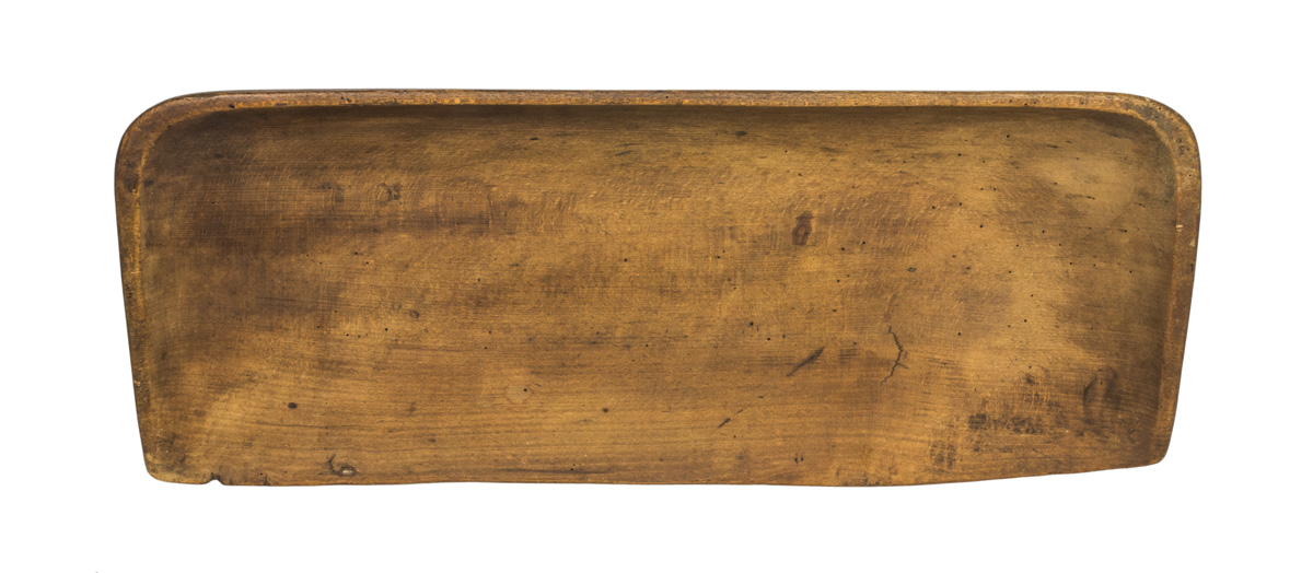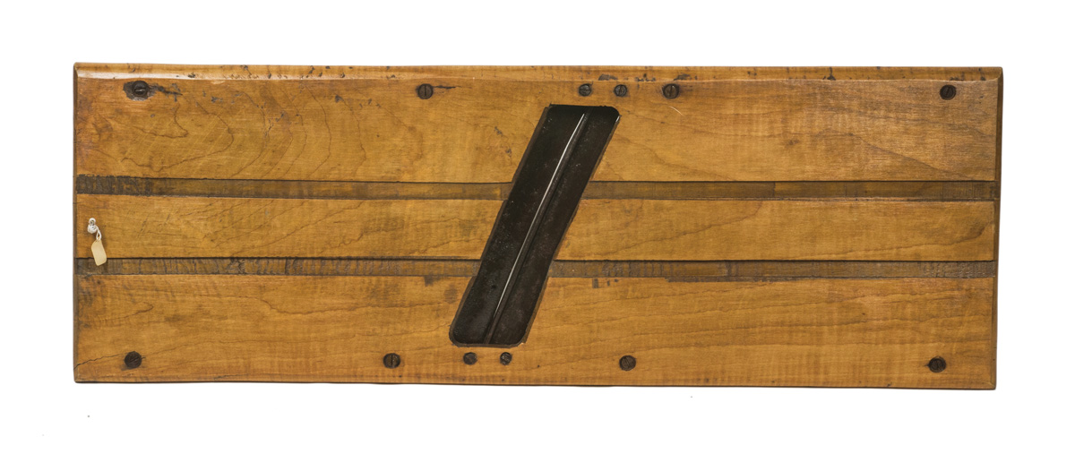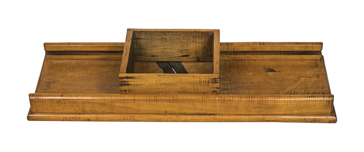Cabbage slicer, tiger maple and oak sliding box for cabbage, two blades, 5 1/2″ h, 33″ l, 12″ w; Scooped sorting tray (one piece, maple), curved back and slightly curved sides, 2 1/2″ h, 27″ l, 11″ w; Carved wood scoop (one piece), with hole in handle for hanging, tagged “North Family”, 12″ l; Large carved scoop (one piece, maple), old split with Shaker wire repair, tagged “So. Shakers, Enfield, CT”, 18″ l; (ex. estate of Robert R. Sokol Sr. collection).