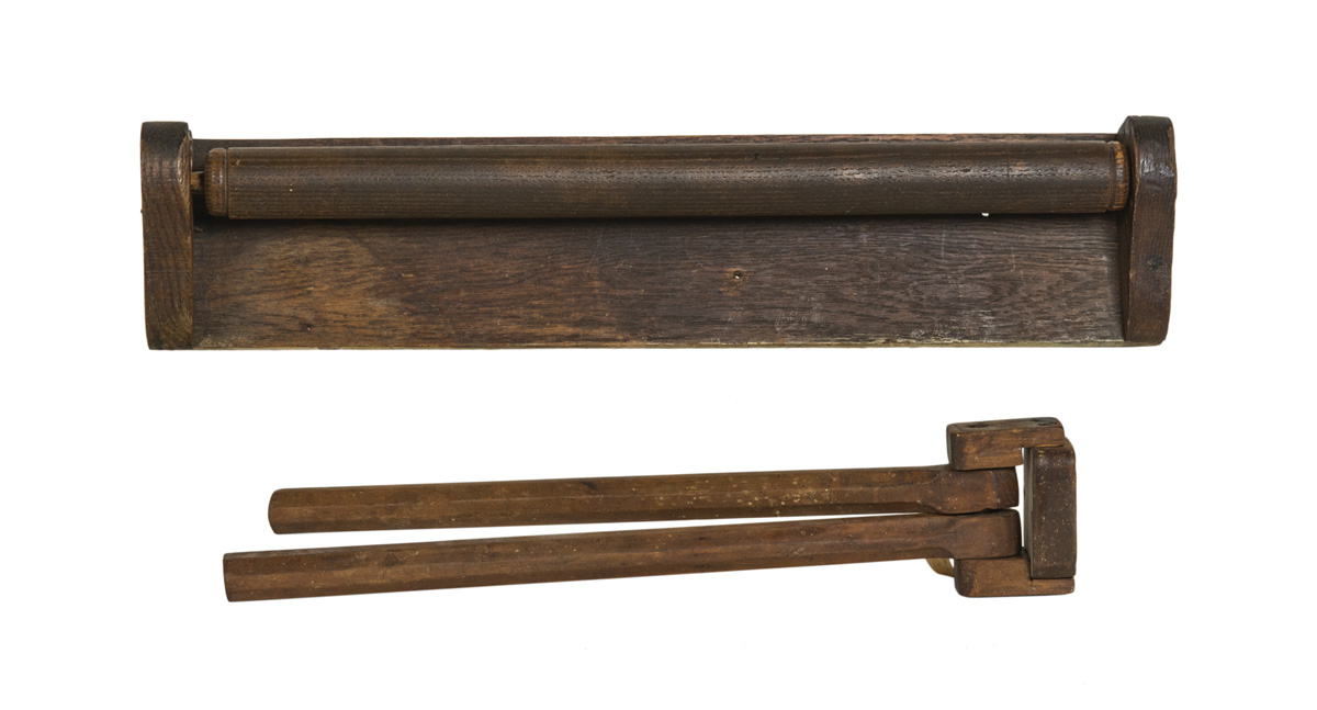 Oak, original dark stained finish, backboard with two carved end brackets, rolling pin slides in and out, 4 1/2″ h, 20″ l; Double pin towel rack with a wooden bracket, carved cherry, octagonal swinging arms, original old finish, tagged “North Family, Enfield Ct. Shakers”; (ex. estate of Robert R. Sokol Sr. collection).