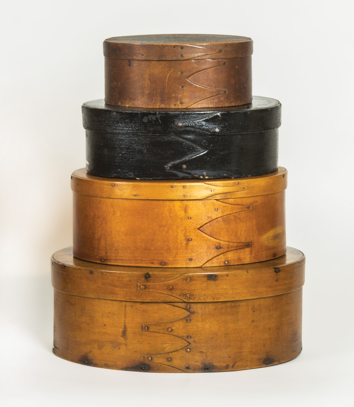 Pine and maple, original stained finish, three fingers, copper tacks, some interior rim damage, 5 7/8″ l; Black painted finish, three fingers (right to left), 7 3/4″ l; Original light red stain, three slender fingers, 8 3/4″ l; Varnish finish, four fingers (right to left), some staining at bottom iron tacks, and a small break at left side, 10″ l.