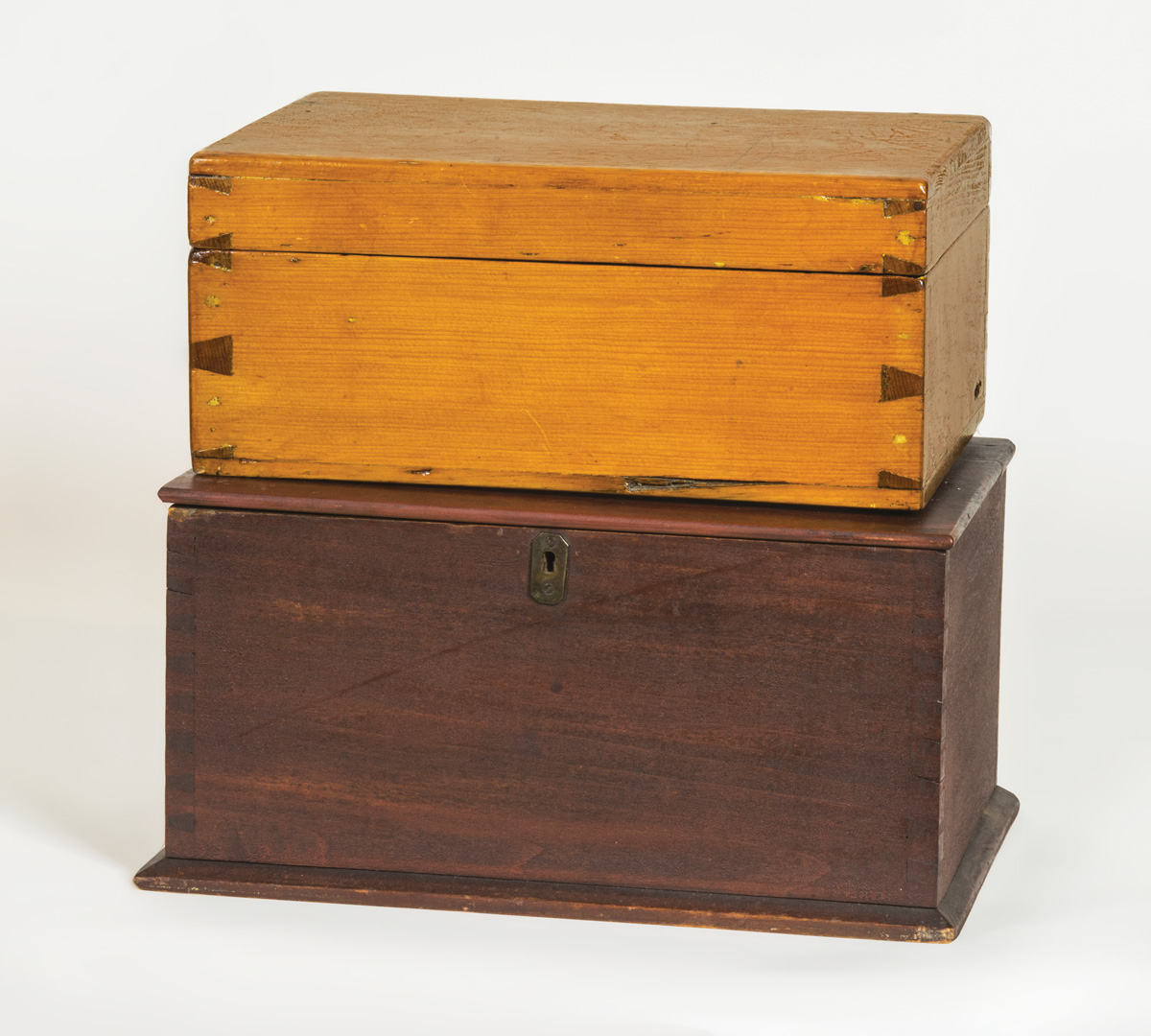 Pine, varnish finish, lift lid (hinged), large dovetails, black painted interior, tagged “Church Family, Trustee House”, 5 1/2″ h, 12″ l, 8″ d; Cherry, rectangular box, original dark stained finish, hinged lid carved to fit interior, fitted for a lock but was not used, brass escutcheon plate, finely dovetailed case, extended canted baseboard, tagged “North Family”, 6 3/4″ h, 13 1/2″ l, 9″ d; (ex. estate of Robert R. Sokol Sr. collection).