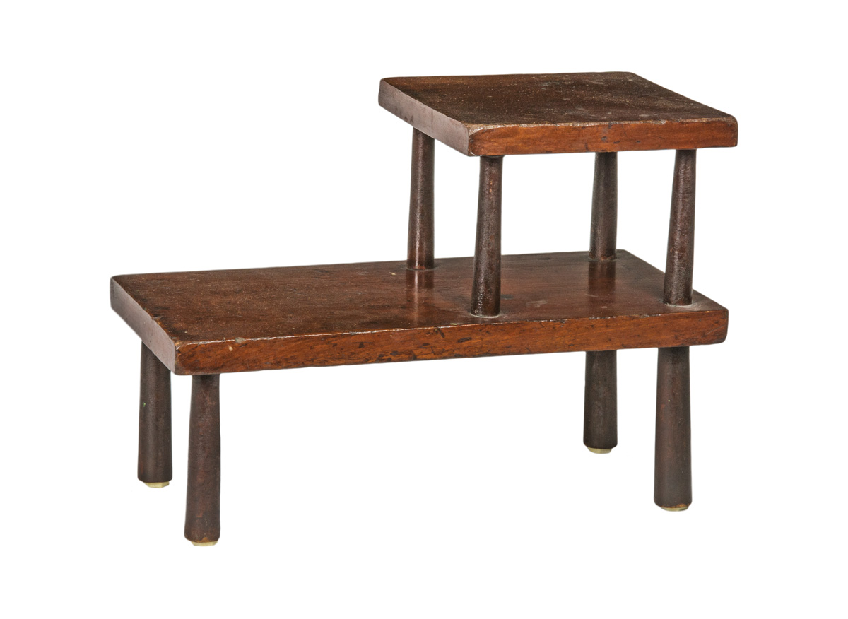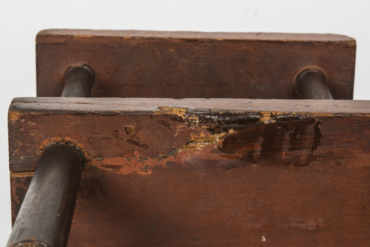 Pine, original lightly stained finish, beveled breadboard ends, finely turned small maple legs, tiny button feet, c. 1840-1850, good condition, 3″ h, 15″ l, 8 1/4″ w; Cherry, original stained cherry red finish, turned shelf support and legs, c. 1850, small early repair at one leg, 9 1/4″ h, 13″ l, 6 1/2″ w.