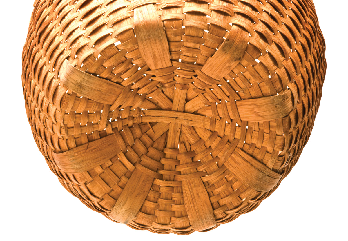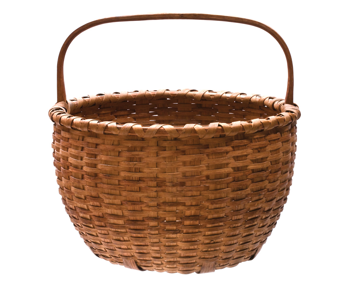 Black ash, single carved hoop handle, finely shaped double wrapped rim, inverted base, overall excellent condition, c. 1850, 14″ h to top of hoop handle, 14 1/2″ dia.