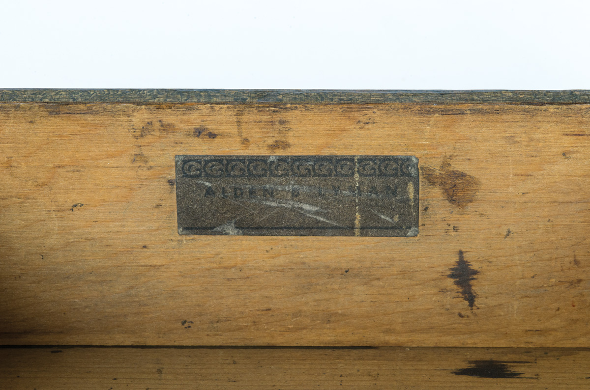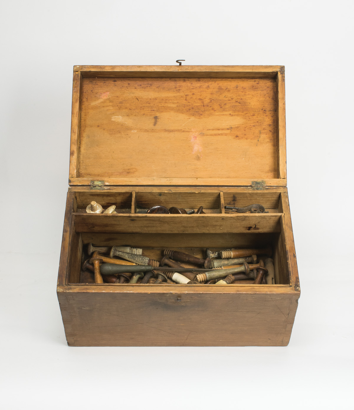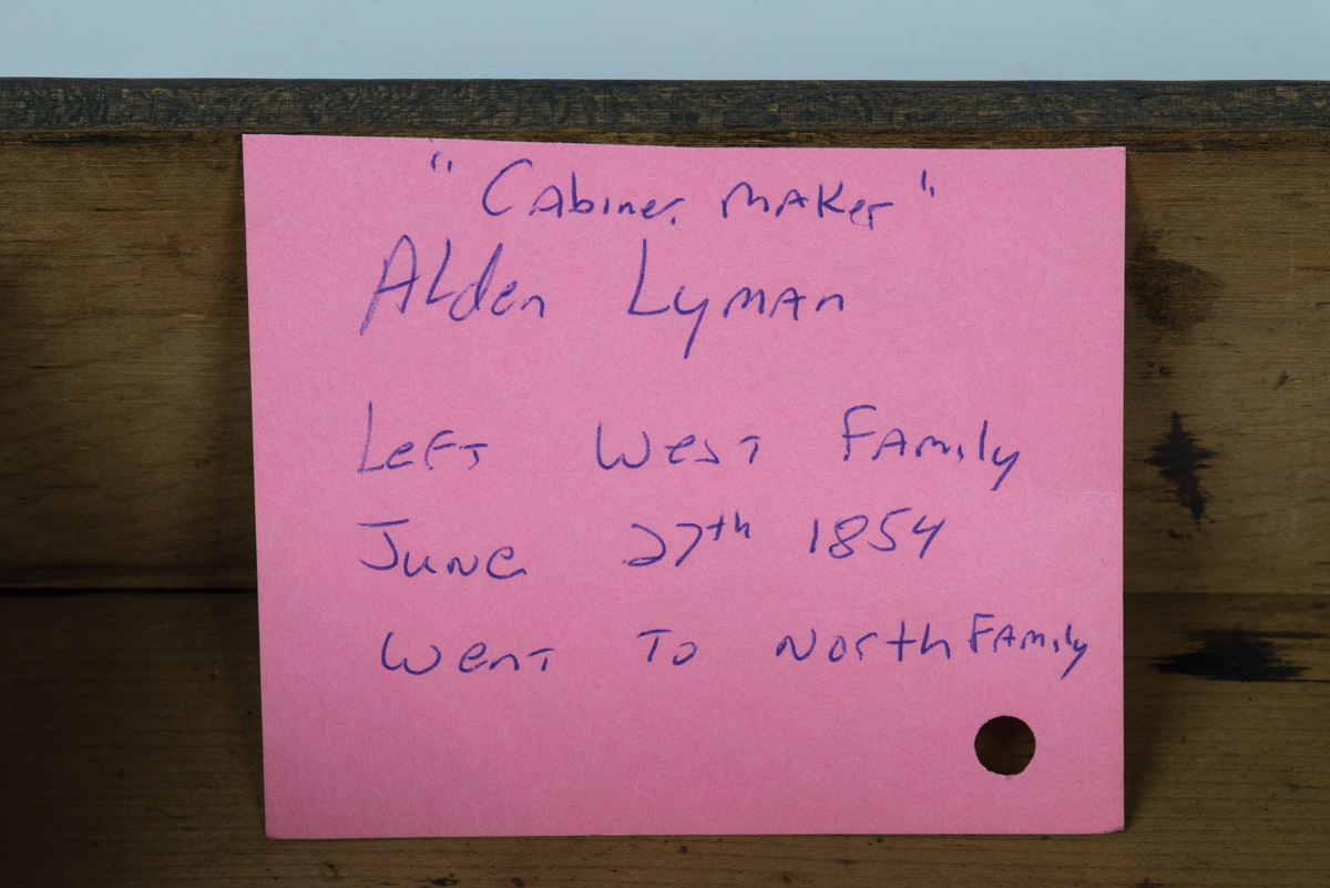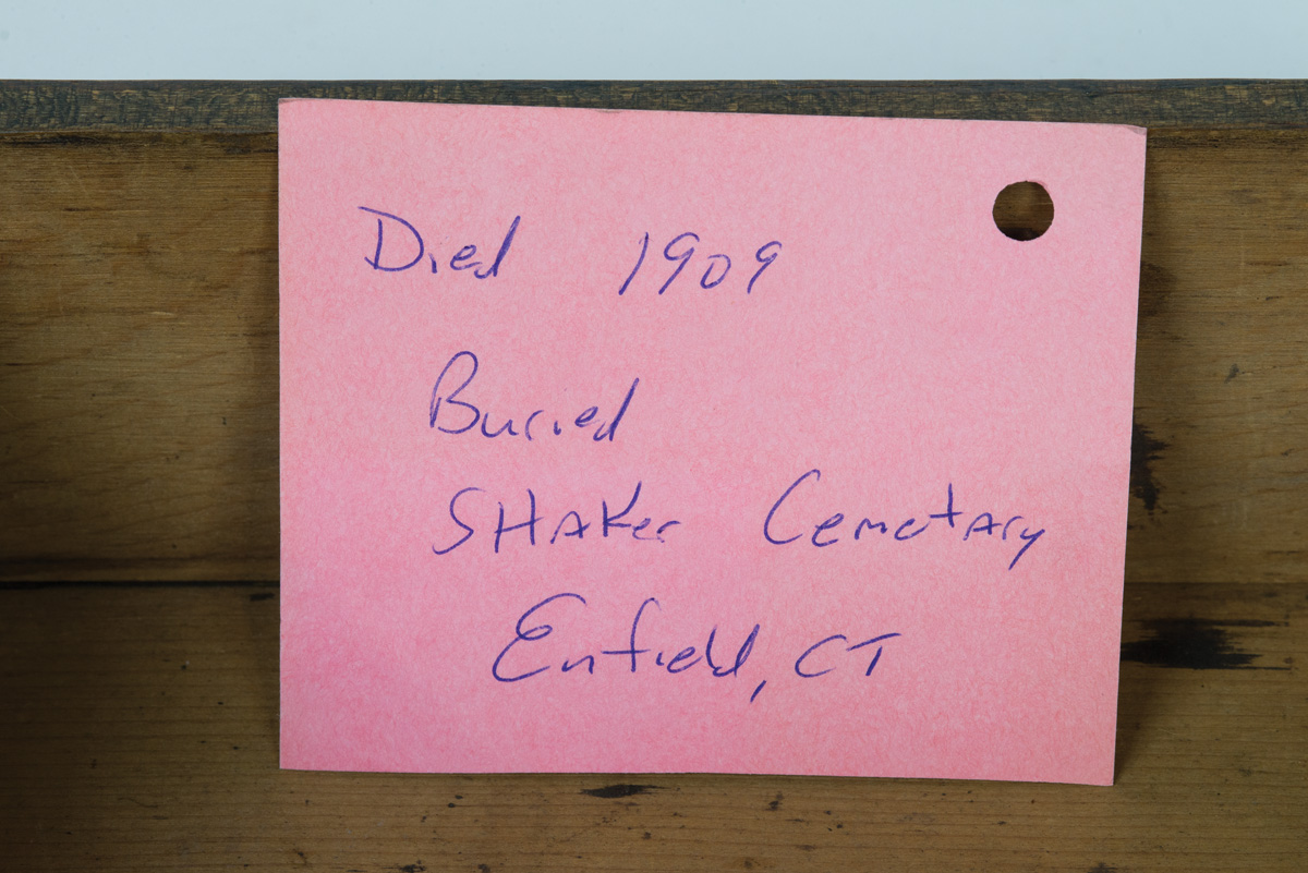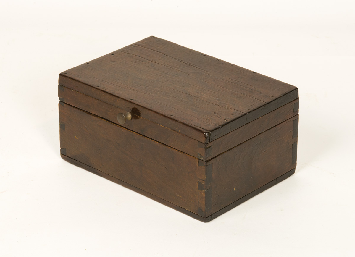 Pine box, early light brown painted finish, dovetailed, paper label inside lid “Alden Lyman”, sectioned interior filled with threaded pegs (approximately 35), drawer pulls, and a few nails, 8″ h, 15″ l, 9″ d; Hinged lid pine box, original dark walnut varnish stain, dovetailed, brass pull to lift lid, paper labeled inside on box front “Alden Lyman”, tagged “Left West Family, June 27th 1854, Went to North Family.”, 4 1/4″ h, 8 1/2″ w, 5 3/4″ d; Shaped walnut and leather razor strop, tagged “Enfield, CT., Brother Lyman (Alden Lyman)”, also remnants of a paper label, 12 1/2″ l, 1 1/2″ w; (ex. estate of Robert R. Sokol Sr. collection).