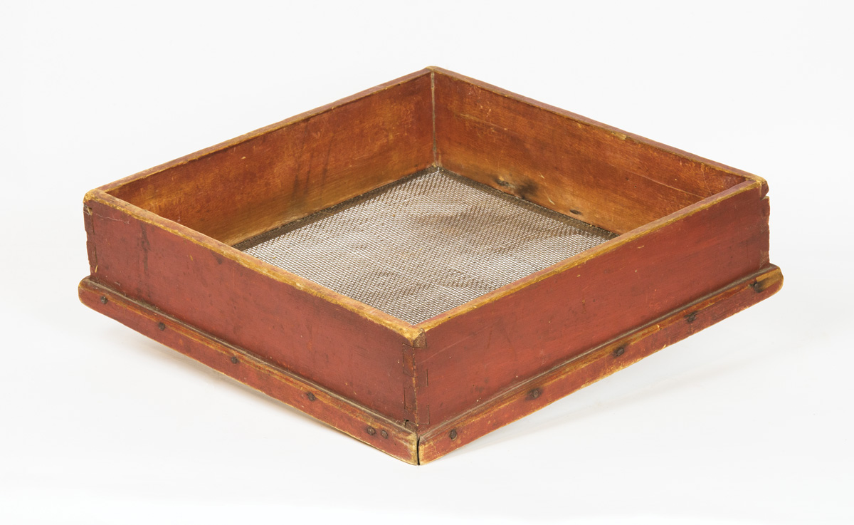 Pine, original red painted finish, inserted screen, dovetailed, applied molding at base, Enfield, CT, 4 1/4″ h, 17″ sq, (ex. estate of Robert R. Sokol Sr. collection).