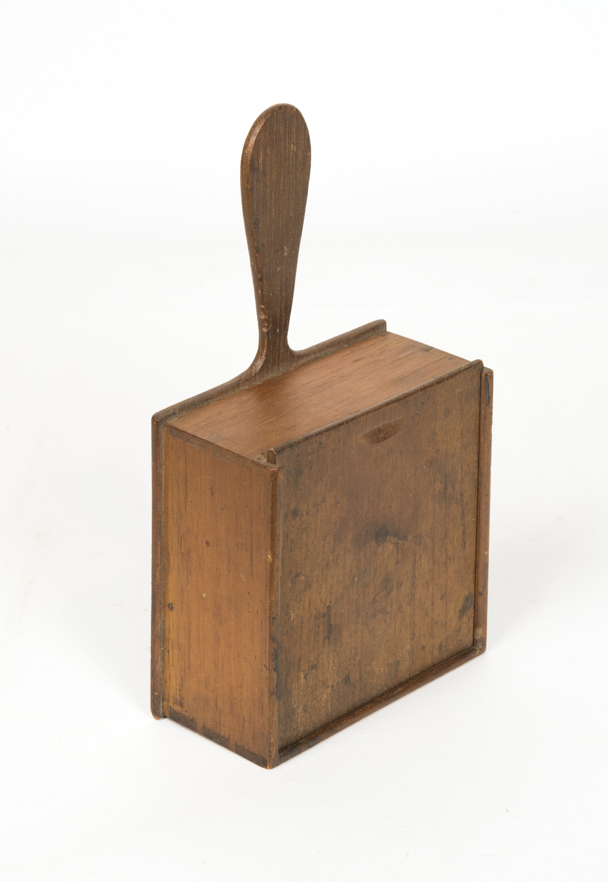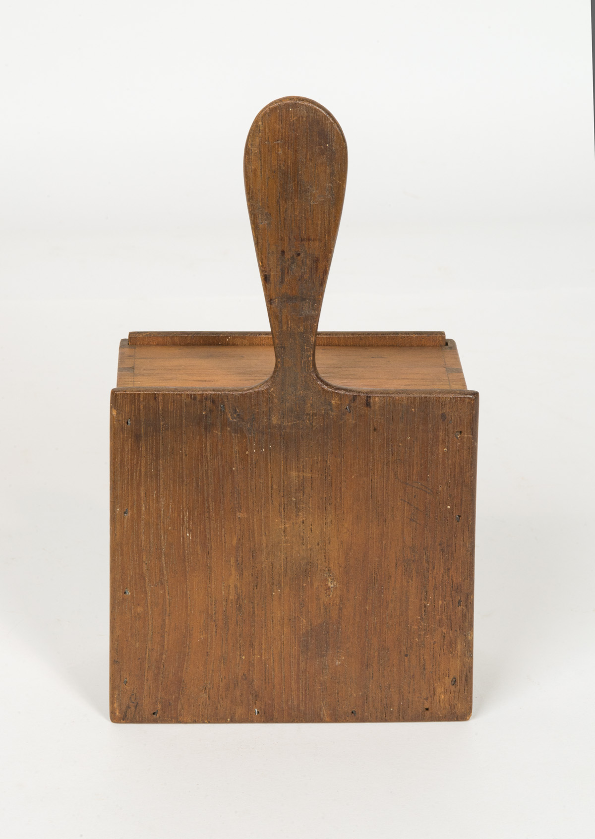 Walnut, original natural finish, slide lid, very thin stock, dovetailed box, carved backboard with extended handle, tagged “Church Family, Donation Box for Public having a “No Cost” dinner at Shaker Station, Enfield, CT.”, initialed on bottom in pencil “JHK” or “THK”, (note: an exceptional Shaker box with history), 9 3/4″ l, (ex. estate of Robert R. Sokol Sr. collection).