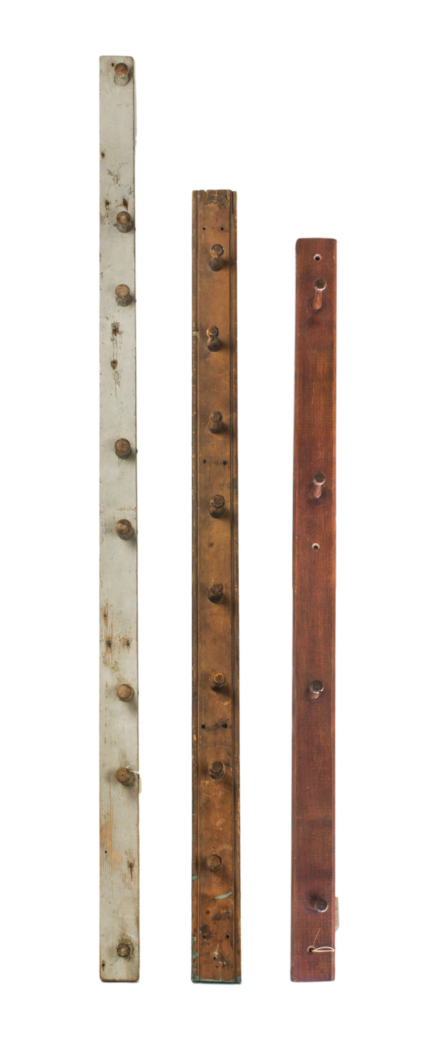 Pine, gray/blue paint, eight pegs, 5′ 3″ l, 2 1/2″ w; Pine with thumbnail molding, red stain, eight pegs, 4′ 6″ l, 3 1/4″ w; Walnut, glossy varnish finish, tagged “from the house of John Copley, the Enfield CT Shaker’s business agent”, 4′ 2″ l, 3″ w; (ex. estate of Robert R. Sokol Sr. collection).