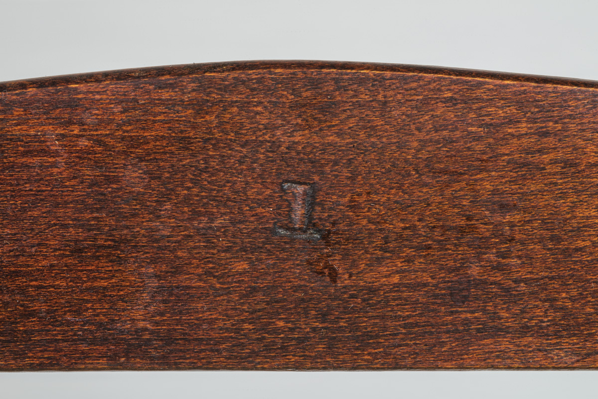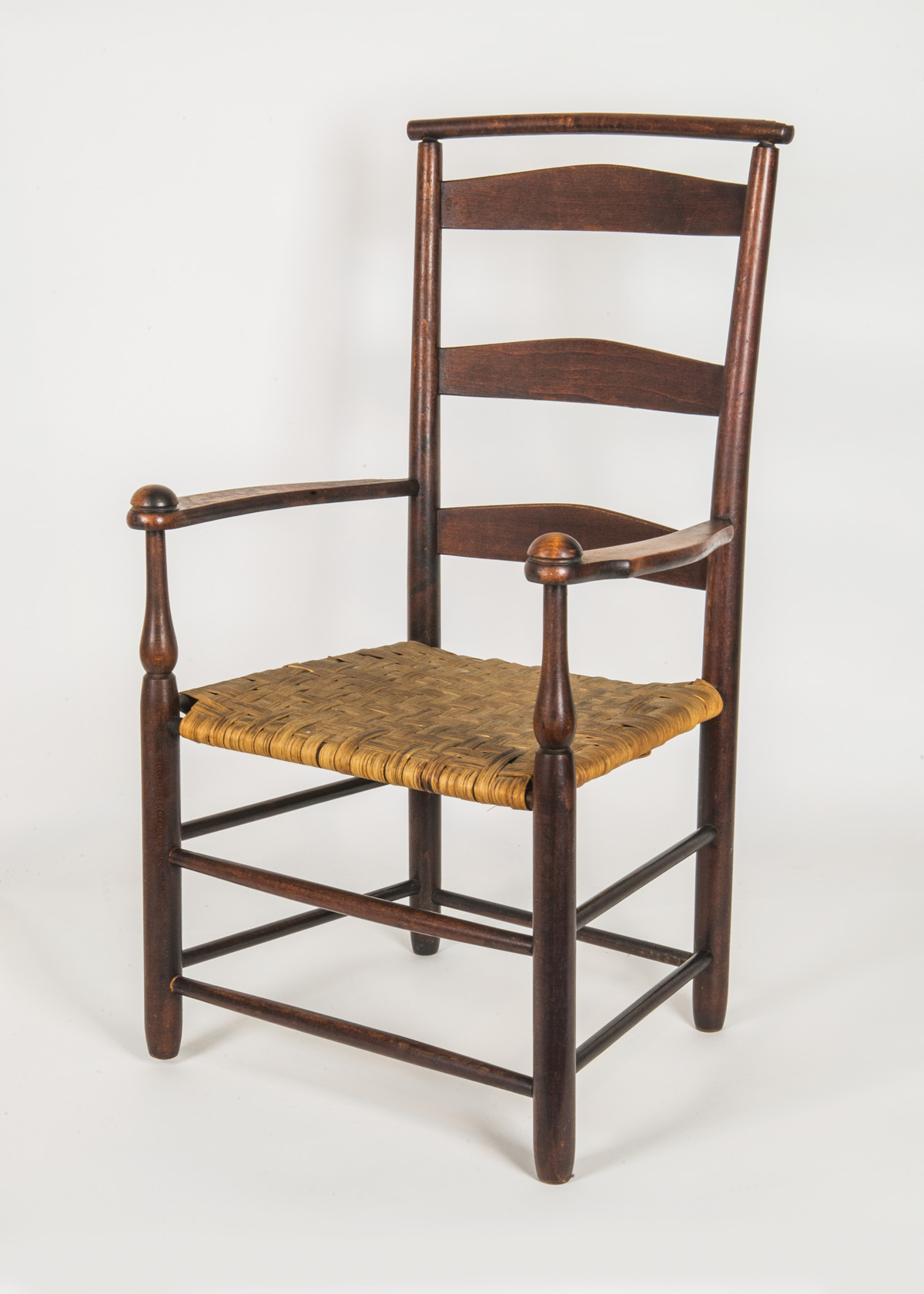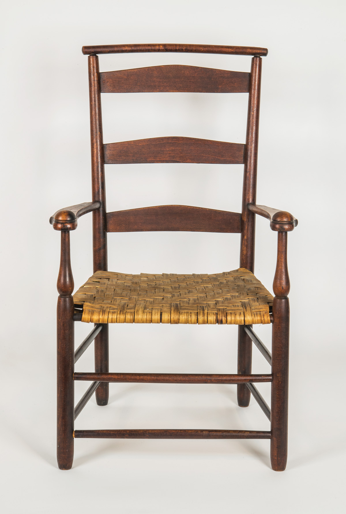 Maple, original walnut stained finish, tiger maple shawl bar, three shaped ladders, curvilinear arms with turned caps, woven splint seat, “1” on back of top slat, Mt. Lebanon, NY, c. 1880, good condition.