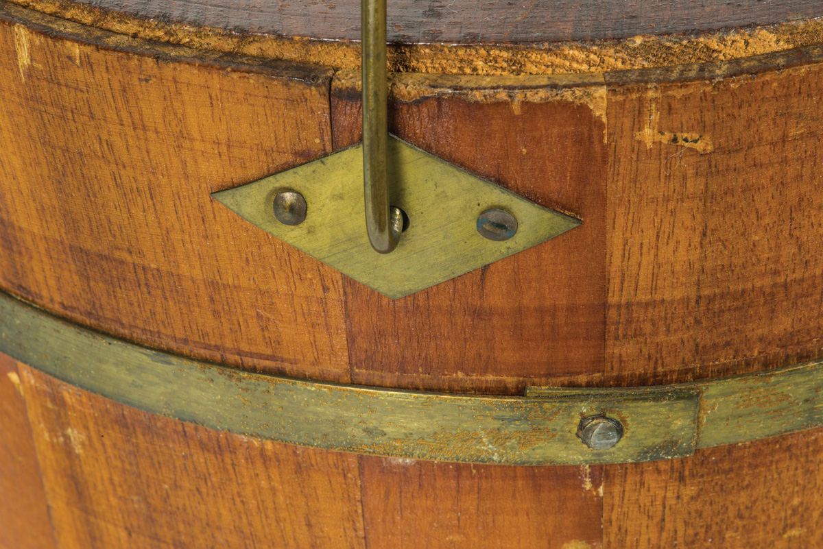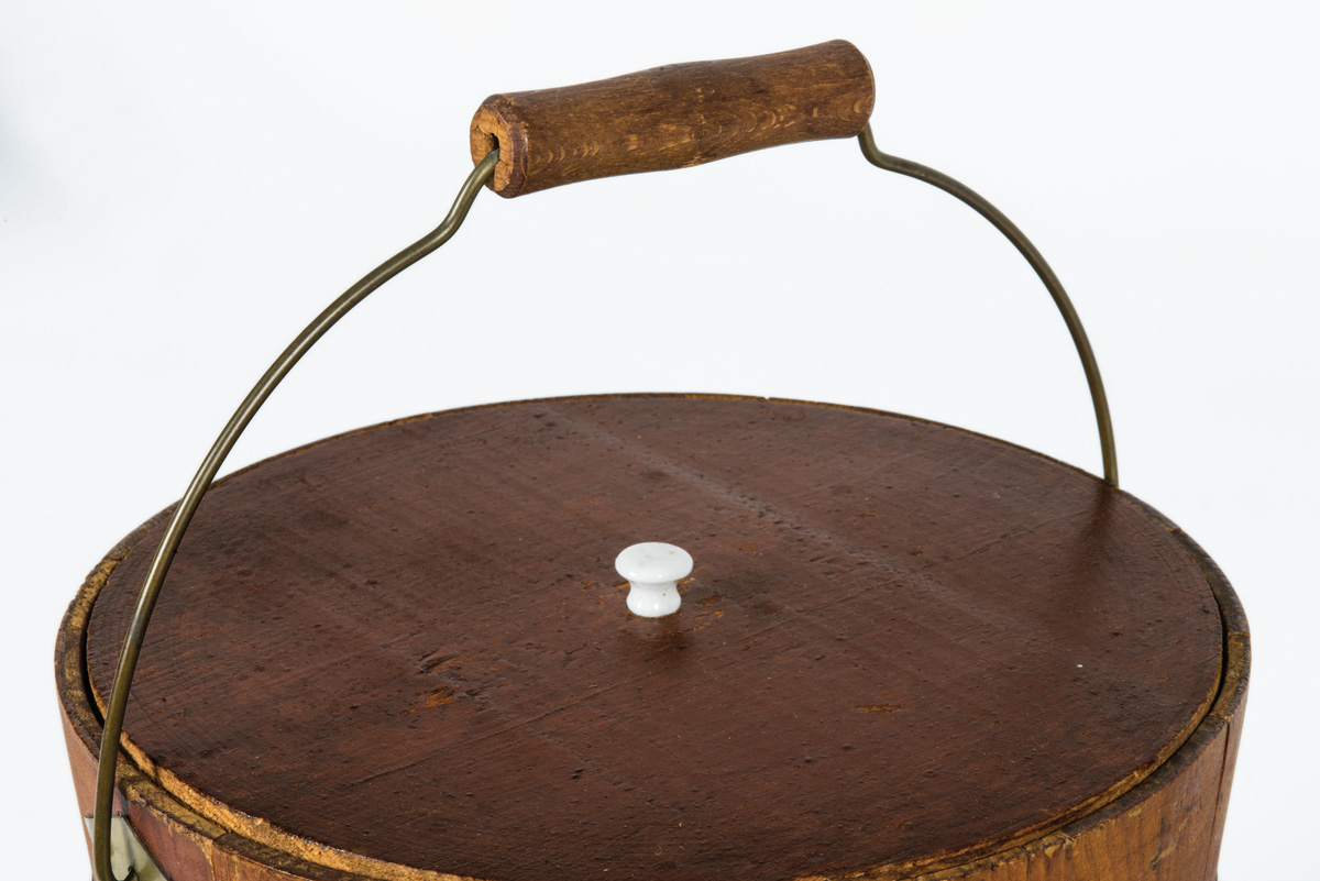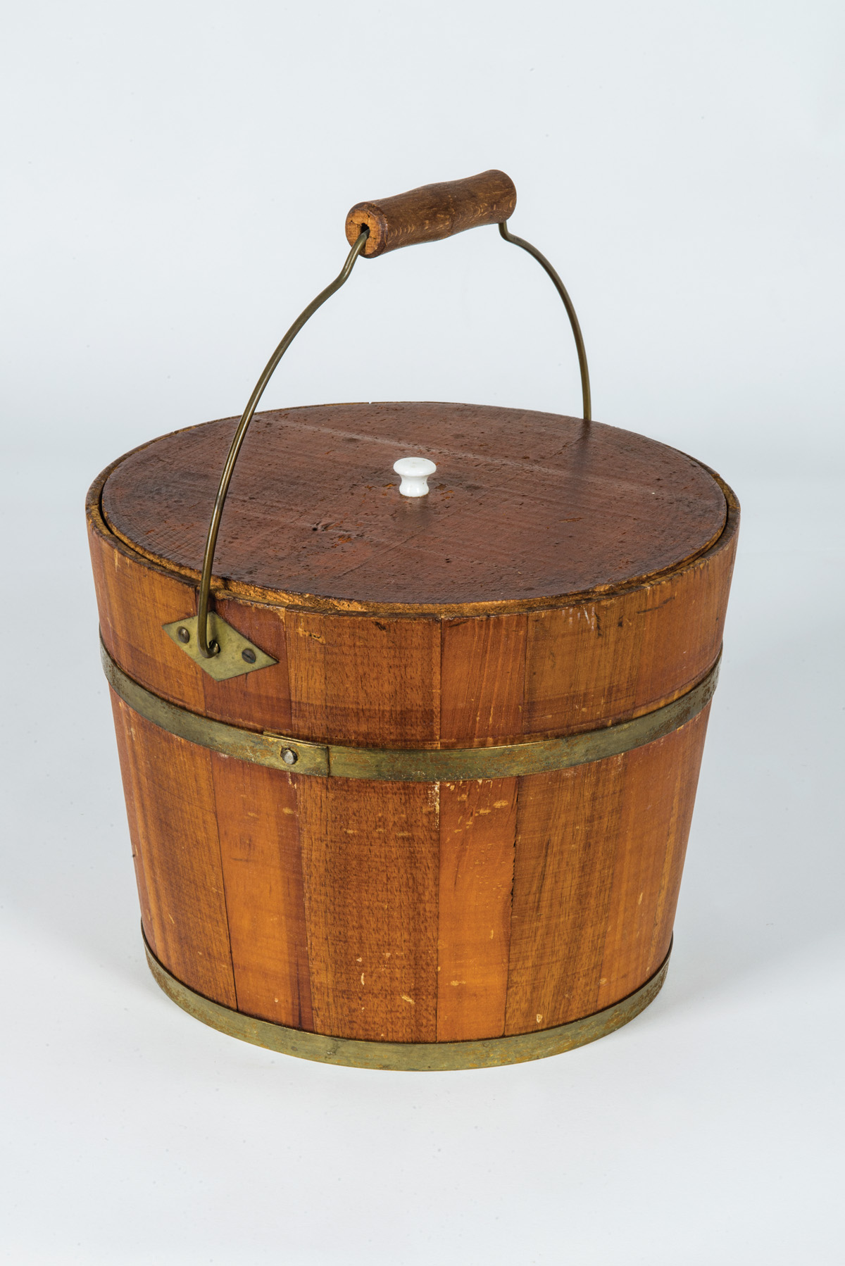 Pine, original red/brown stained finish, fitted turned lid with small porcelain pull, brass swing handle with turned maple grip, brass diamond shaped bale plate, two brass hoops, Hancock or Mt. Lebanon, c. 1850, excellent condition, 8″ h, 13″ h (to top of handle), 9 3/4″ dia, (ex. James Brown collection).