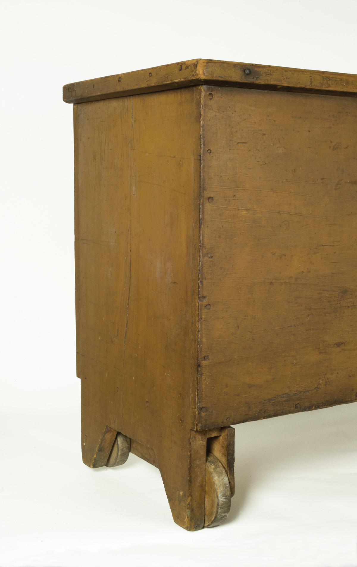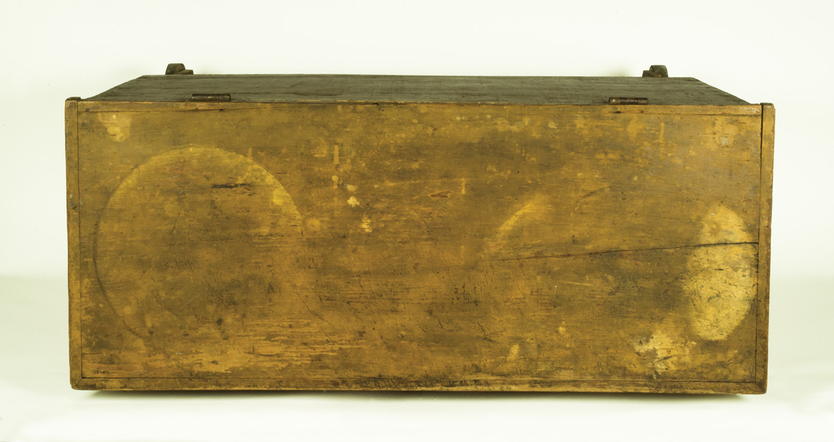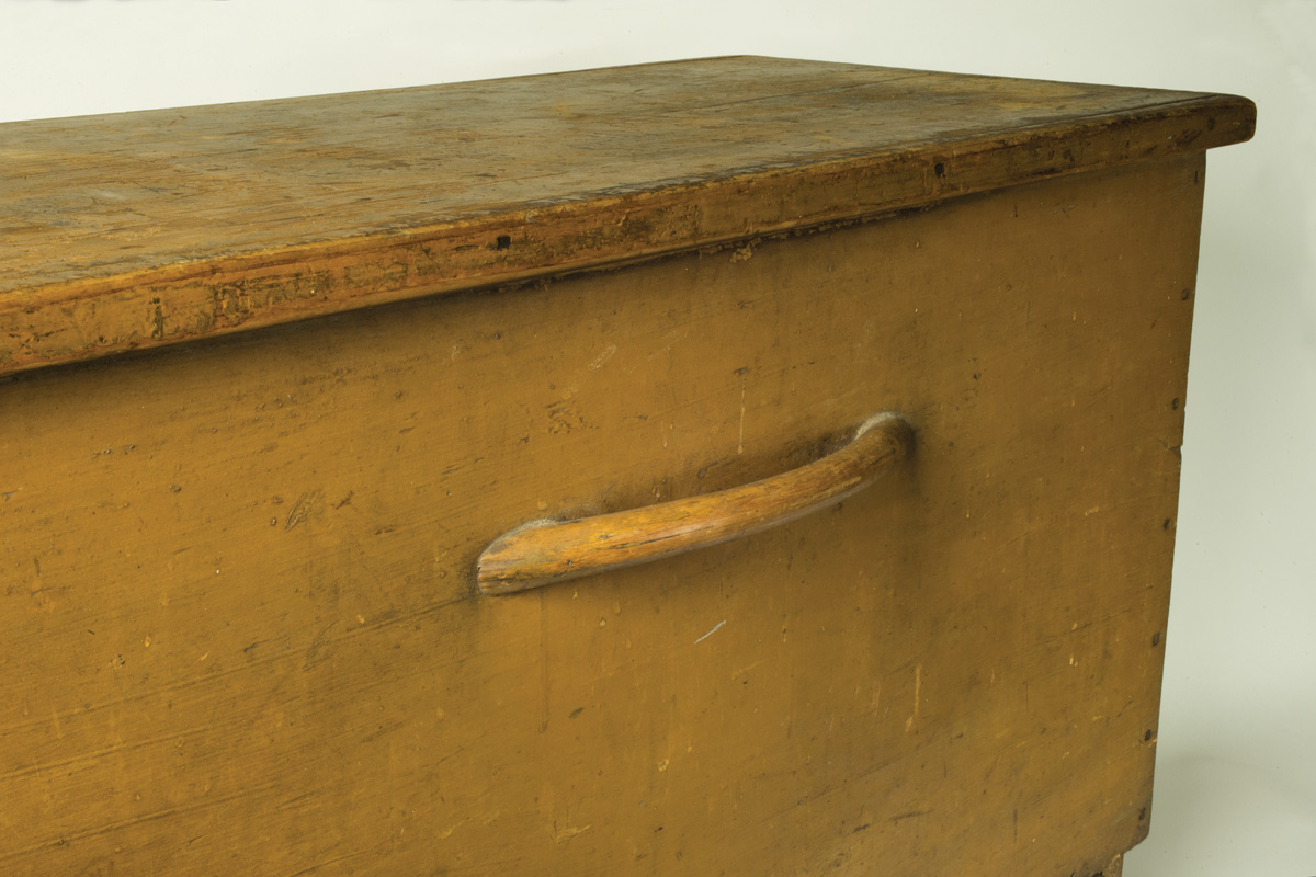 Pine and white wood, original mustard painted finish, simple molded hinged lift lid, some stains, opening to two sections for kindling and logs, carved handle applied to front, 4 1/2″ maple wheels at base, box can be easily moved forward and backward so floor can be swept, (note: this is the only wood box we have seen that has this feature), c. 1850, pencil signed in script on inside back “Building #3”, 24 1/2 “h, 36″ w, 15” d.