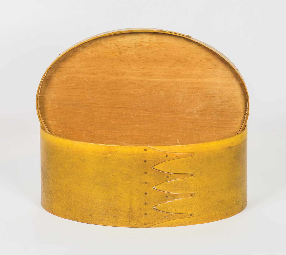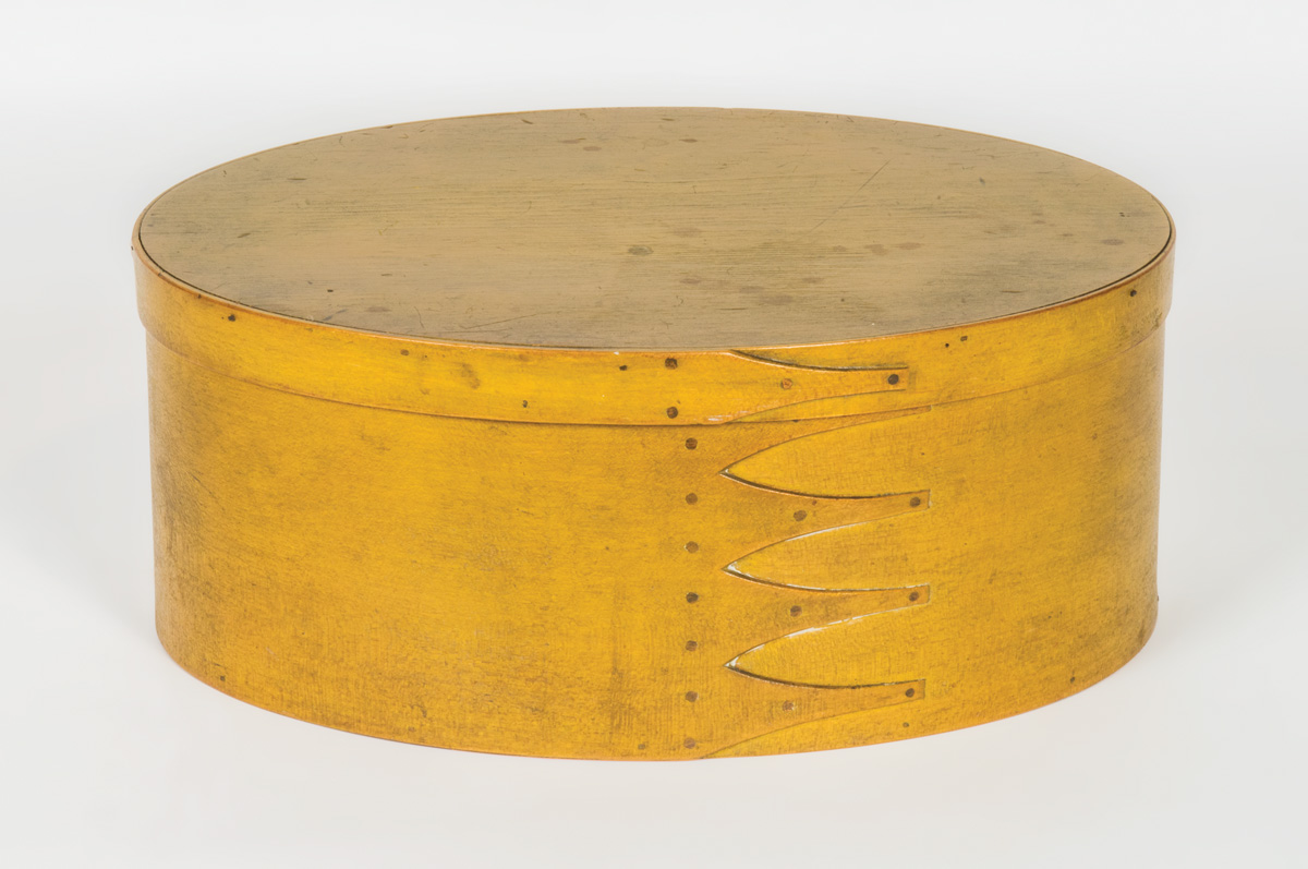 Maple and pine, original chrome yellow painted finish, five fingers, very finely tapered and finished with copper tacks, Hancock Shakers, c. 1830-1840, 5 3/4″ h, 13 1/4″ l, 9 1/4″ d, (ex. James Brown collection).