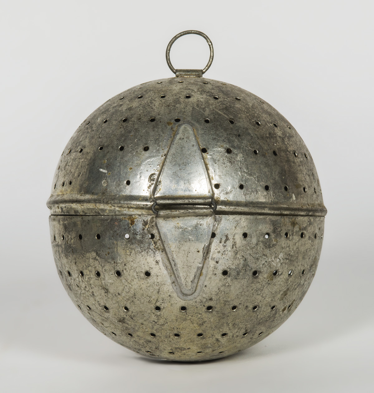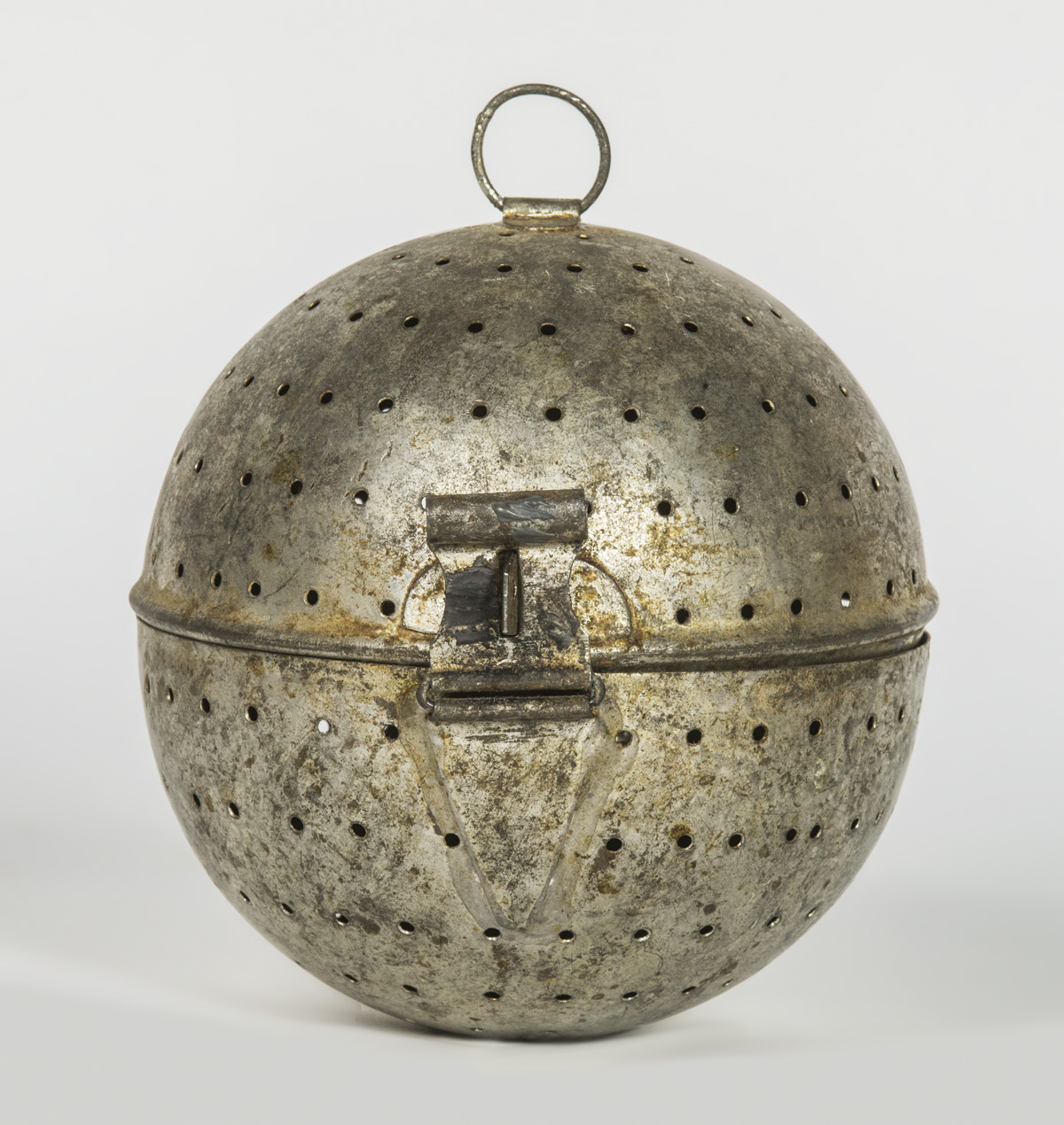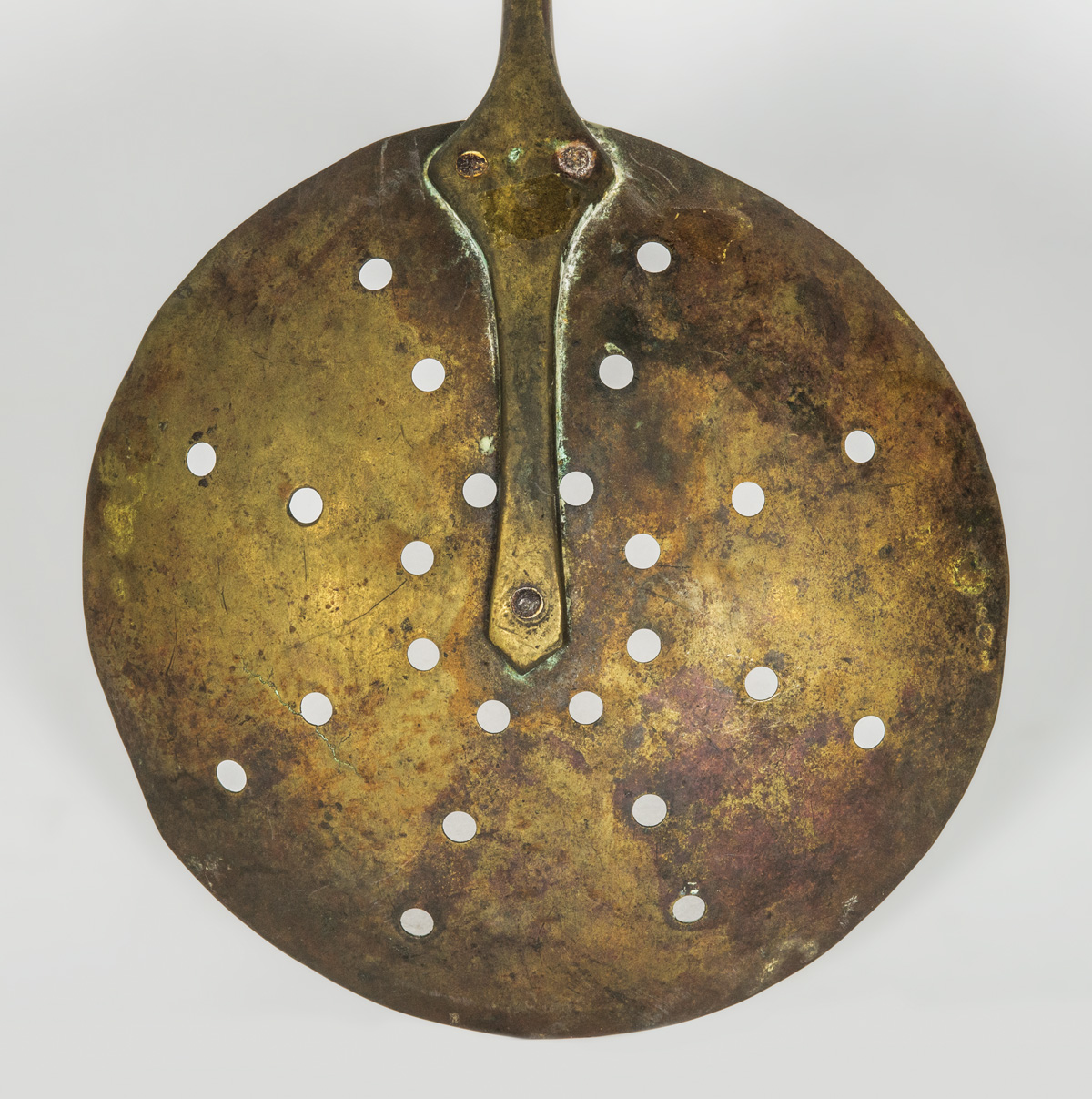 Tin tea ball, punched with holes, hinged and secured with a folded latch, tagged “Church Family”, 5″ dia; Two tin strainers, one with an attached screen; Forged iron spatula, with 9″ handle terminating in a turned hardwood Shaker pull, 14 1/2″ overall l; Brass long handled skimmer, tagged “From John Copley House, Enfield, CT”, (ex. estate of Robert R. Sokol Sr. collection).