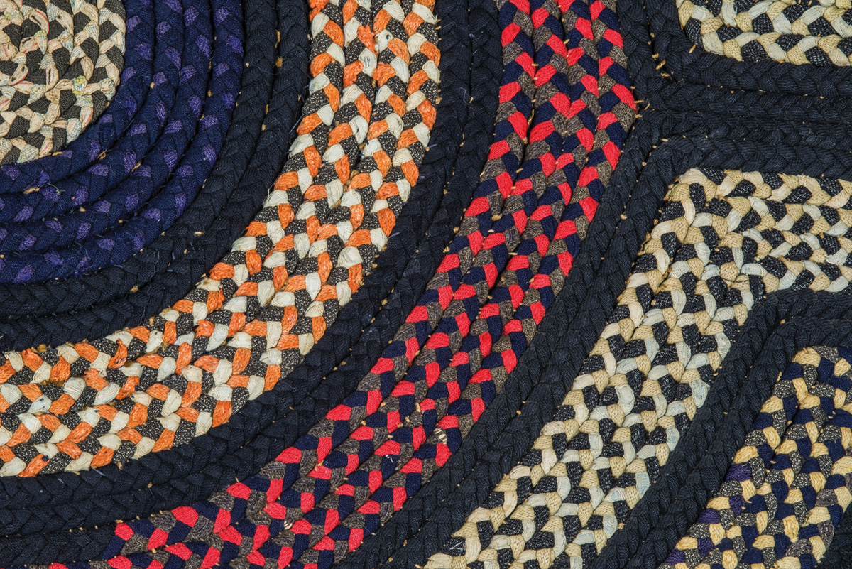 Concentric wagon wheel spokes emanating from a central light colored circle, each outlined in two black braids, alternating light and dark, hexagonal scallop shape, each braid made up of three distinct cotton strands, reds, grays, cream, royal blue, olive green, and black, very tightly braided, c. 1900-1920, braided in the Shaker style, mounted on a wood frame for hanging, 52″ dia (rug), 54″ dia (frame). [See Fig. 55, p. 109, Shaker Textile Arts, Beverly Gordon, 1980, University Press of New England.]