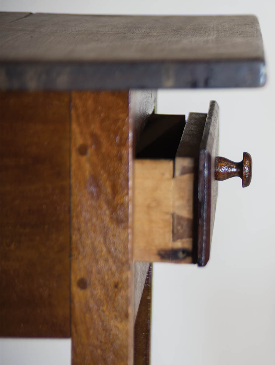 Cherry and poplar, single board top (18 1/4″ sq), single dovetailed drawer with beveled lipped edge, finely shaped Shaker turned pull, red stained varnish finish on base, square tapered legs wood pegged into skirt, (Note: sold at Richard M. Withington auction 9/26/1992 to Dr. J. J. McCue, original sale slip included), 26 1/2″ h, (ex. J.J. McCue collection).