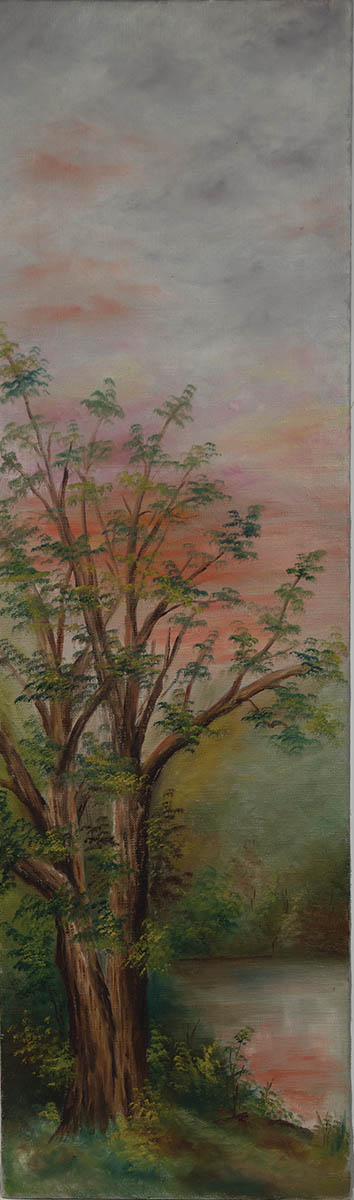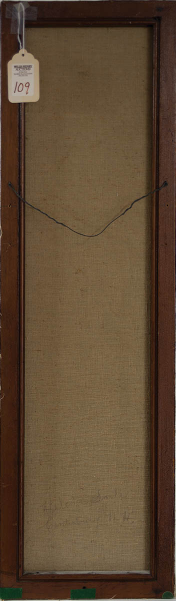 Stretched on a window screen frame, landscape with tree and pond at sunset, pink sky, signed in pencil on back “Helena Sarle, Canterbury, N.H.”, (sold WHA, 10-10-04, lot 109), 32 1/2″ h, 9 3/4″ w.