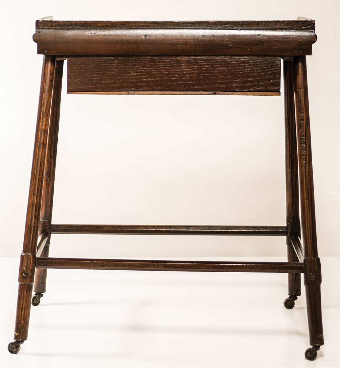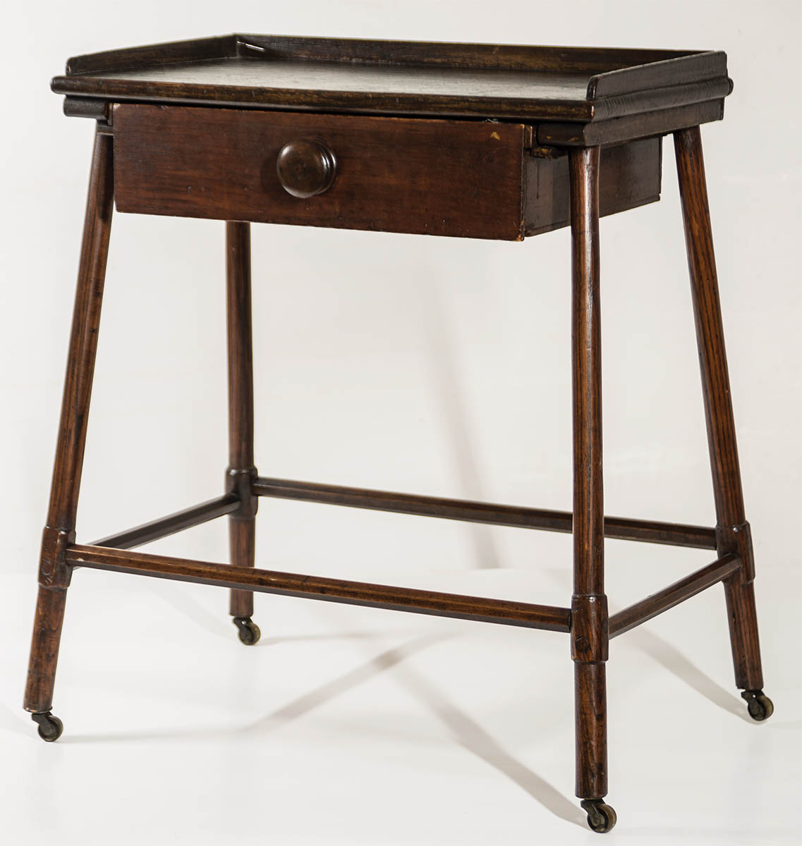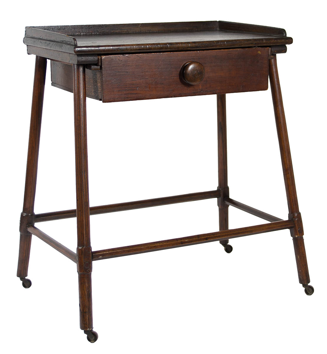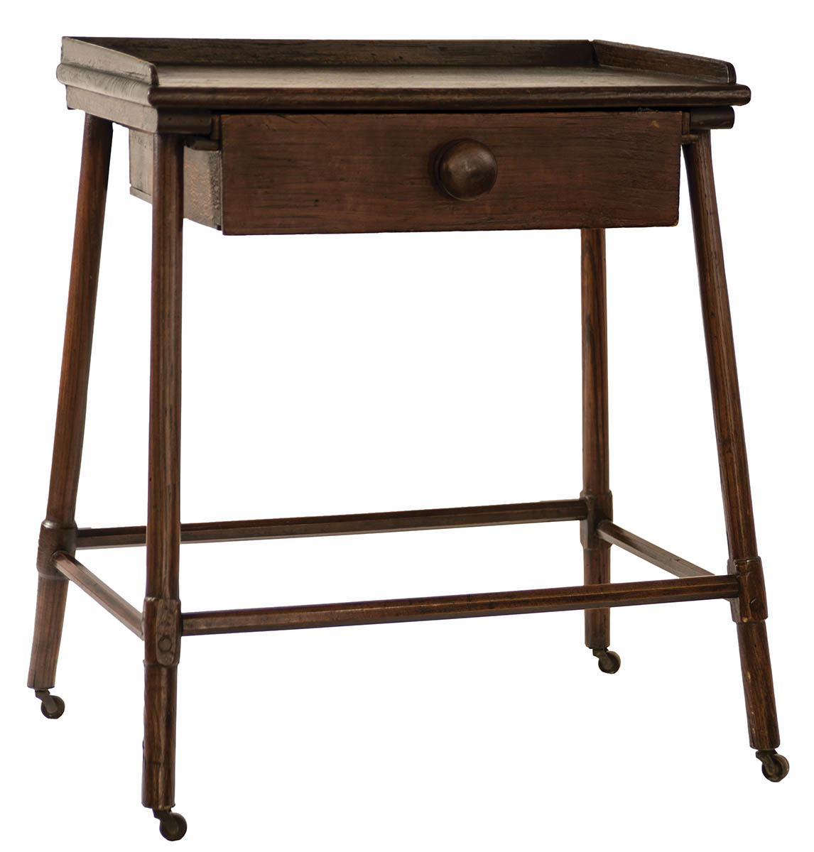 Pine and maple, original dark varnish red stained finish, underhung full-length drawer with walnut turned pull, splayed legs with octagonal stretchers on brass castors, reportedly from Union Village Ohio Shaker community, once owned by Clark Garrett, famous Fairhaven, Ohio dealer, (sold WHA, 7-13-19, lot 125), 25″ h, 20 3/4″ w (at top), 13″ d.
