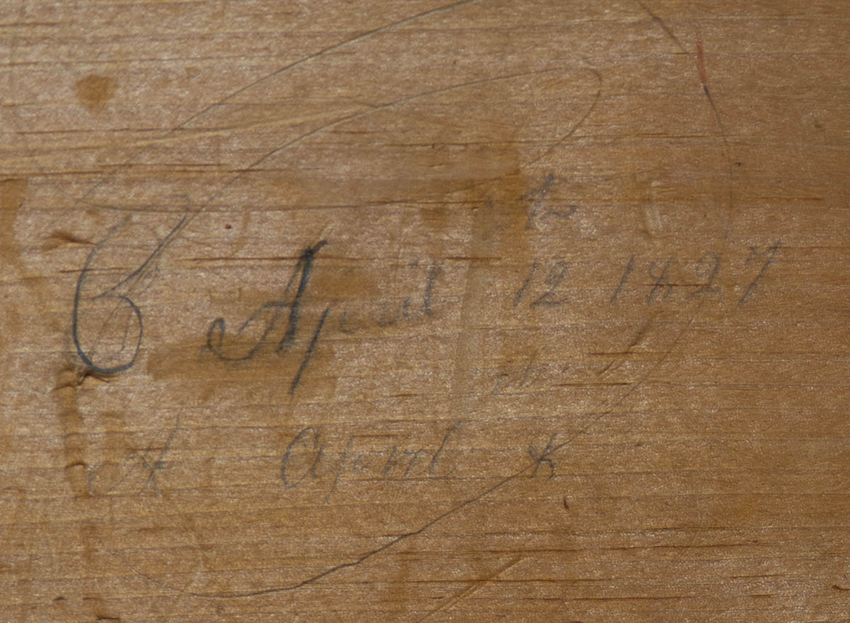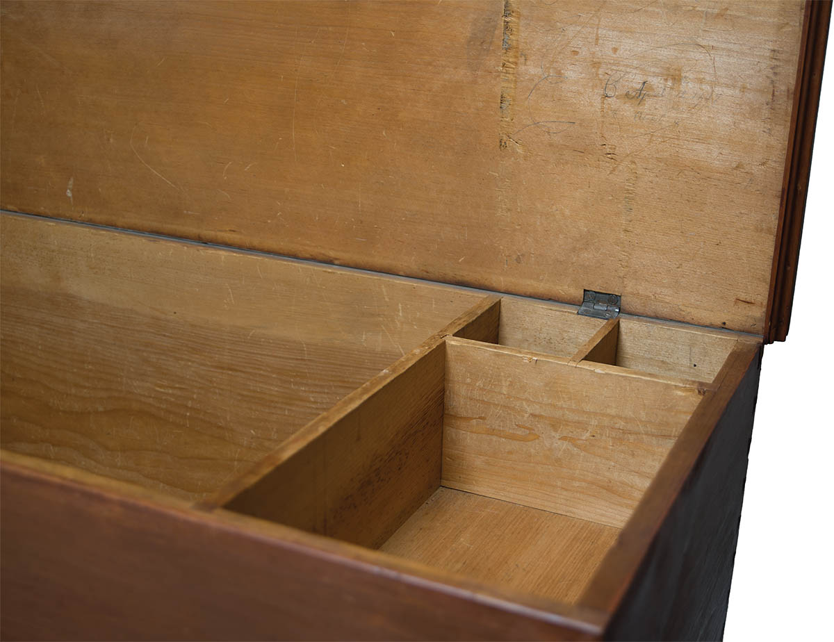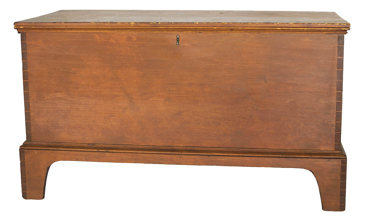Pine, original red stain, excellent condition, hinged one board top, dated in pencil “April 12, 1827″ under lid on right, molded edge, three-section till, dovetailed case, tall dovetailed base in front, nailed back, (left back foot reinforced, no key latch is connected to front lock), Watervliet or New Lebanon, NY, 23 3/4″ h, 42″ w, 18” d.