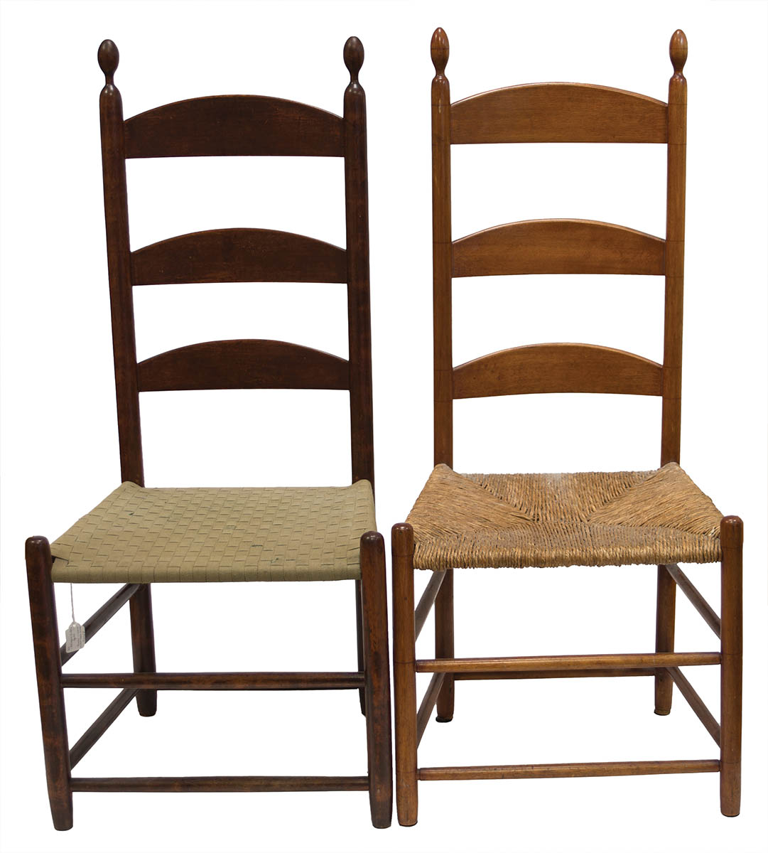 Birch and tiger birch, original dark red stain with varnish, three slats graduated upwards, very early green taped seat, over ticking filled with horsehair or sawdust, original tilters, Alfred, ME, excellent condition, 15″ seat h, 40 3/4″ overall h; Birch, light varnish over light red stain, three graduated slats, early rush seat, original tilters, Enfield, NH, good condition, 15 1/2″ seat h, 41″ overall h.