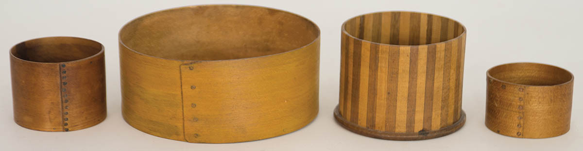 Maple and pine, copper tack seams, on with maple and walnut alternating slats, walnut base, Enfield, CT, 3″ h, 4 1/4″ dia; Two small round measures, 2 1/4″ and 1 3/4″ h; Larger coopered measure, 2 3/4″ h, 6 1/2″ dia.