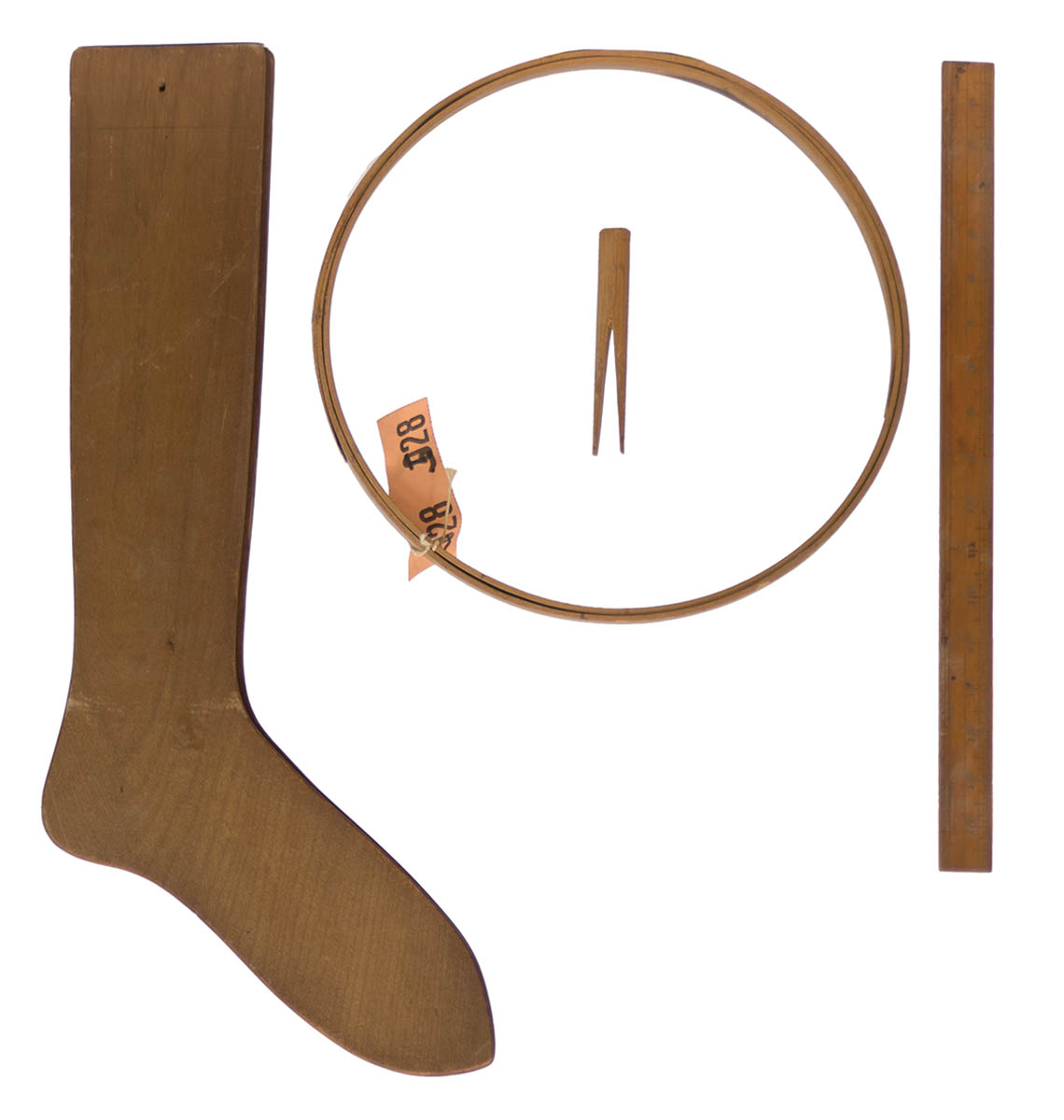 Pair of stocking stretchers, poplar, original finish, (purchased at the Jordan Shaker Auction, 9-27-68, lot 73), “C” (Canterbury, NH Shakers), 18″ l; Sister’s maple hoop, possibly used as an embroidery hoop, (sold at the Jordan Auction, 9-27-68, lot 528, for $5), 12″ d; Hand carved wooden clothespin, maple, original finish, (Jordan Auction, 9-27-68, lot 552), 5″ l; Hand numbered maple rule, 18″ l, in original varnish, numbered on both sides; (Kitty Haas collection).