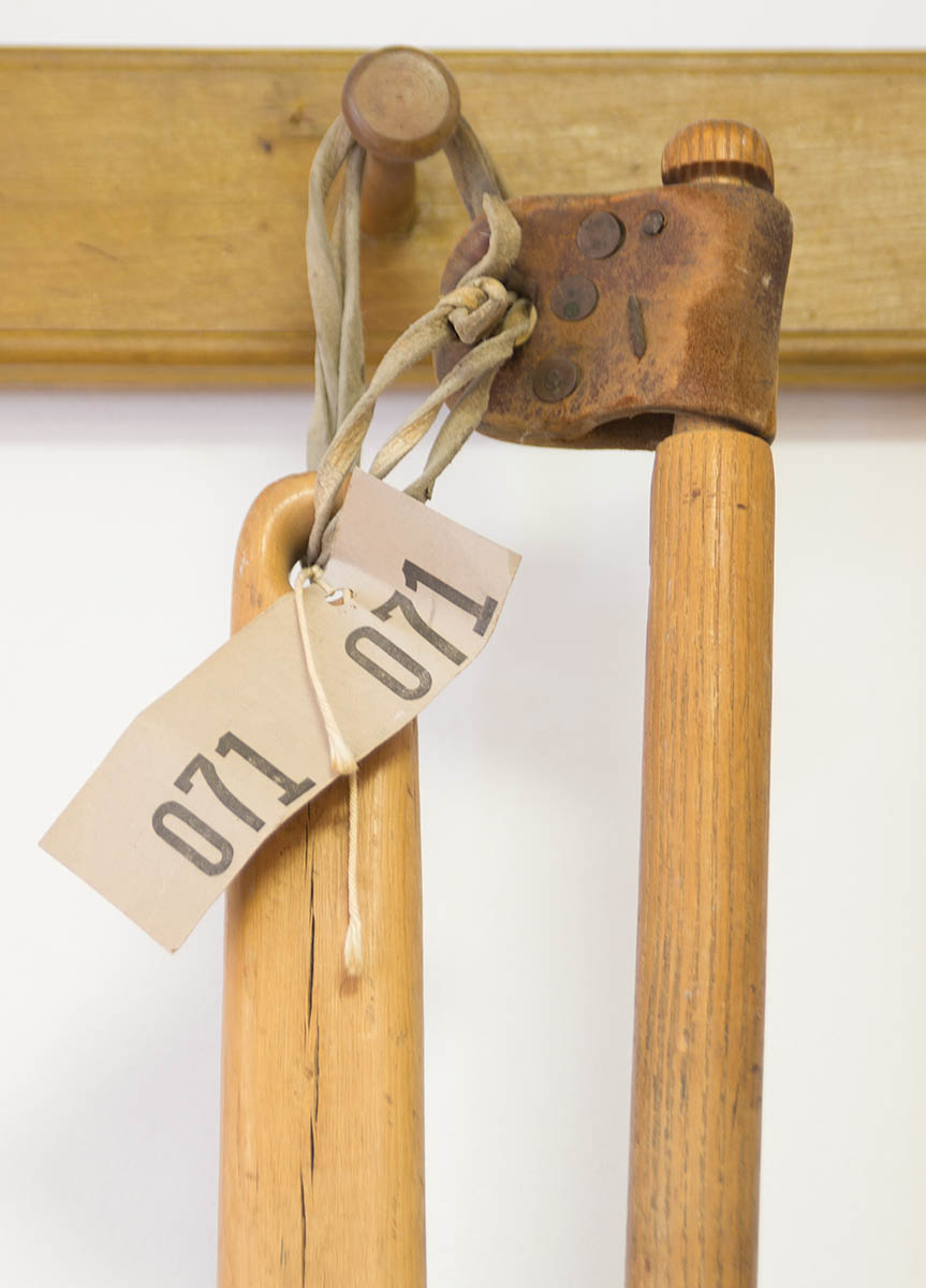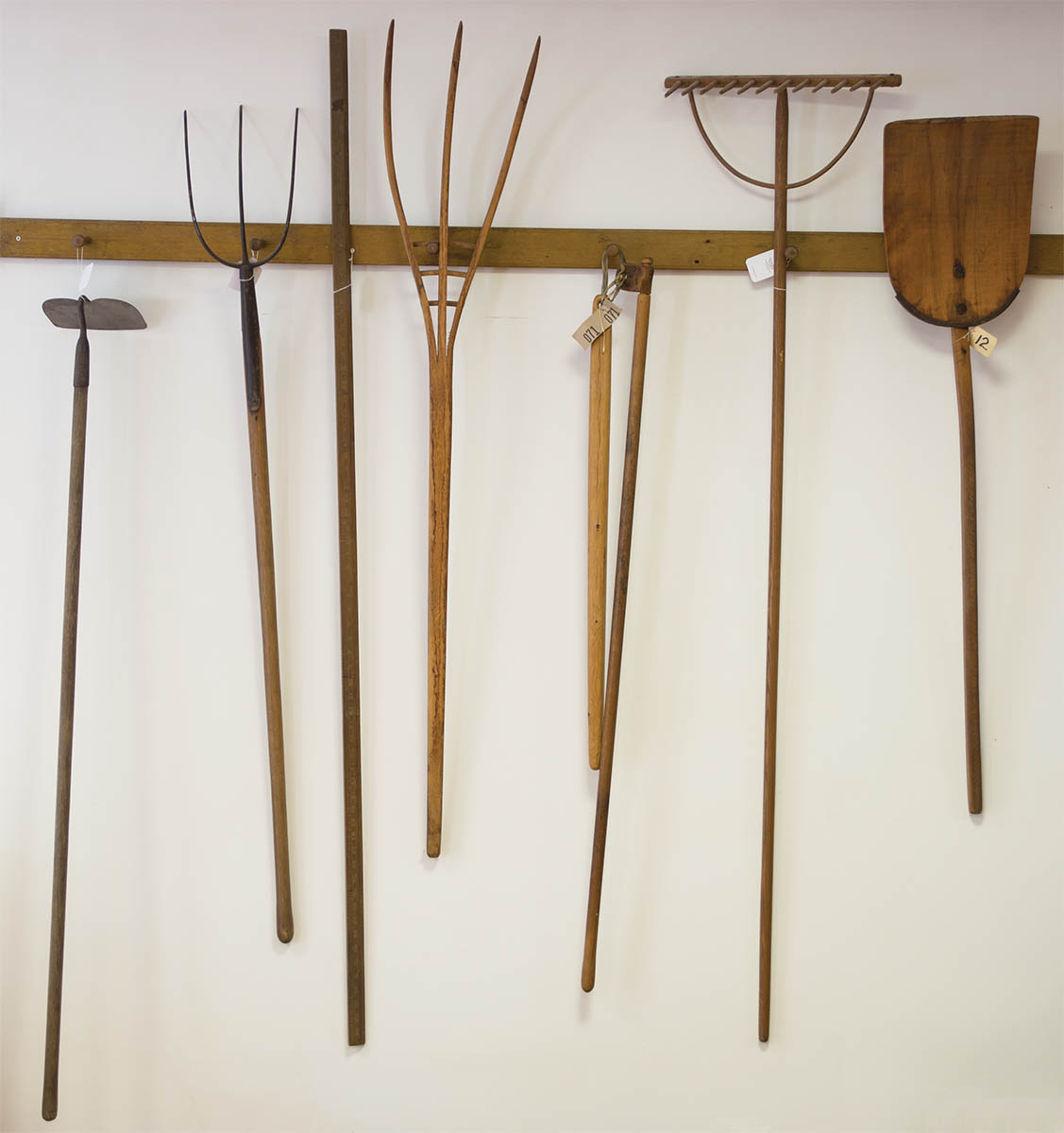 Includes two pitchforks, one with iron and one wooden; a rare double hand-numbered measuring stick, (extending 36″ and 36″); wood tine rake; a hoe; wood shovel with tin wrapped top and shaped handle, (sold WHA); and a flail for thrashing grain, (flax), with a 1968 Jordan Auction tag, lot 71, “wooden flail”, Canterbury, (Kitty Haas collection), 7 pieces.