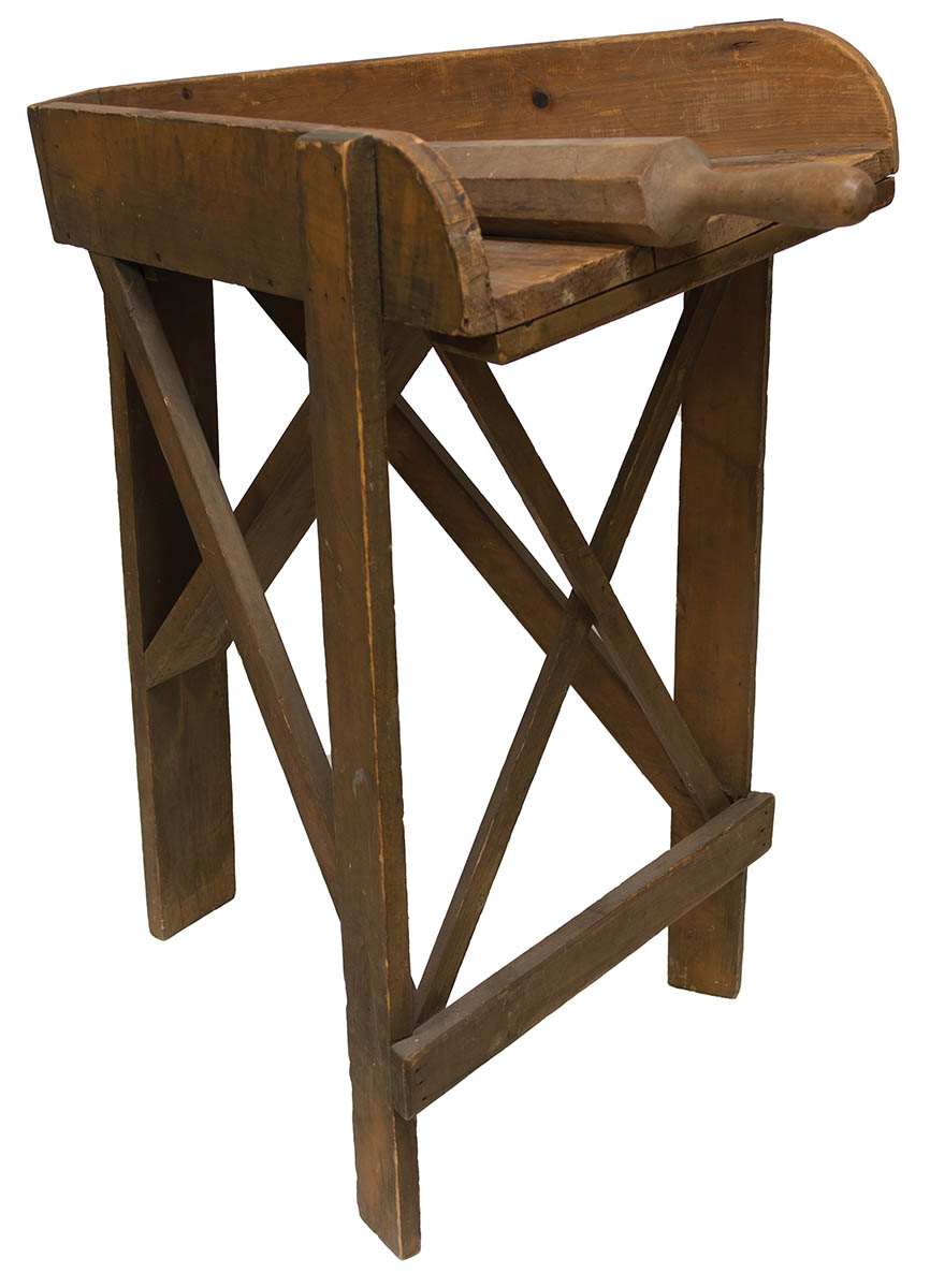 Maple and pine, original gray/green stained finish, triangular shaped slanted shelf, 4″ sides, octagonal roller (34″ l) with turned handle (5″ l), cross-stretcher support at base, c. 1880, 35″ h, 18″ w, (Kitty Haas collection).