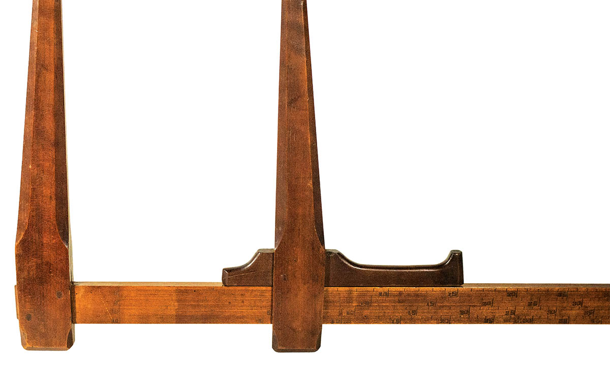 Cherry wood, two vertical measures, both double pinned and lambs tongue chamfering, one stable and one slides across a carved and hand number stamped horizontal board, exceptional Shaker craftsmanship and patina, museum quality, 19 3/4″ h, 38 1/2″ l.
