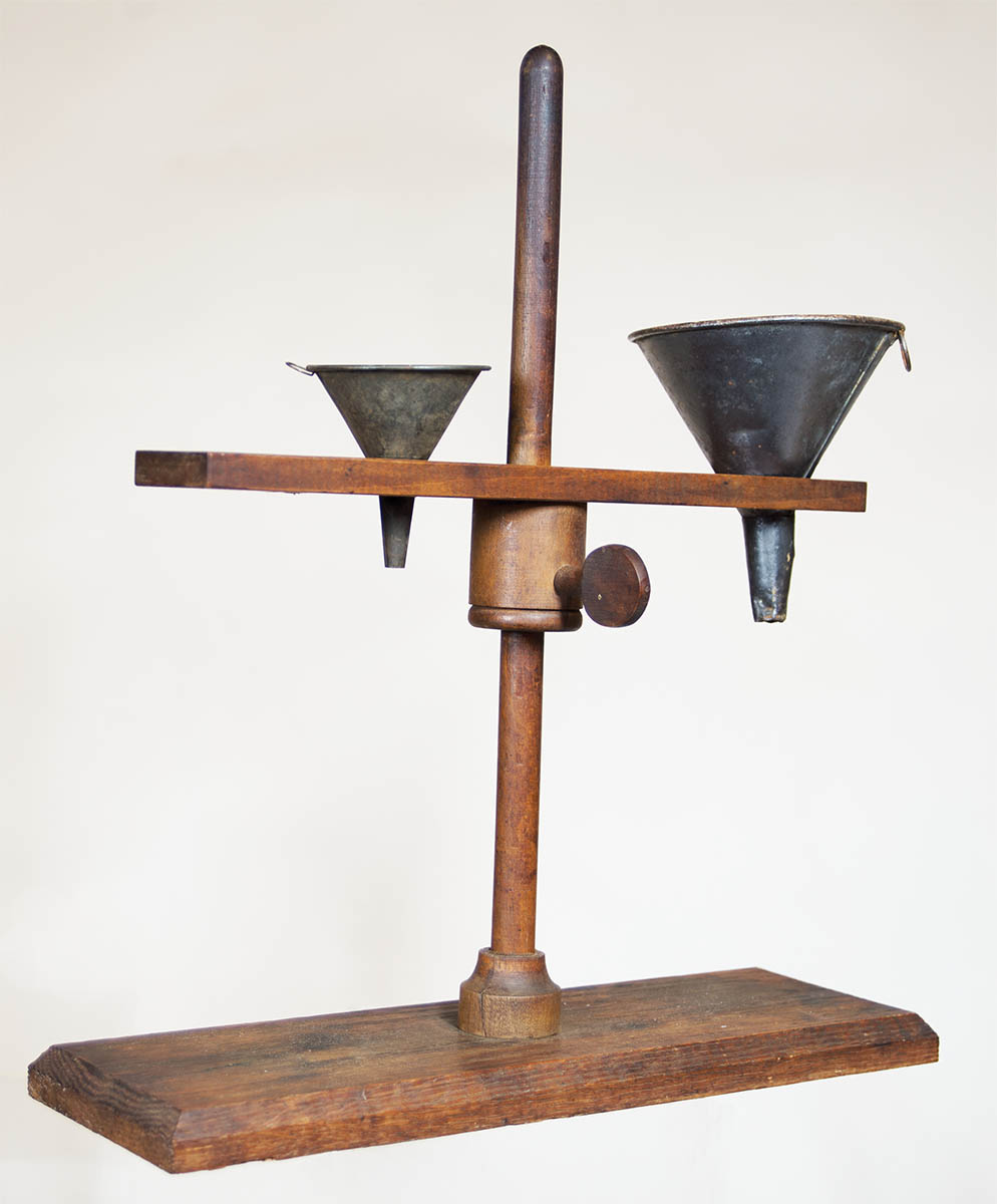 Maple, tin funnels, adjustable horizontal platform, carved for four funnels, threaded thumbscrew, rectangular beveled base, good patina, New Lebanon, NY, c. 1840, 17″ h, 15″ w (base), 5″ d.