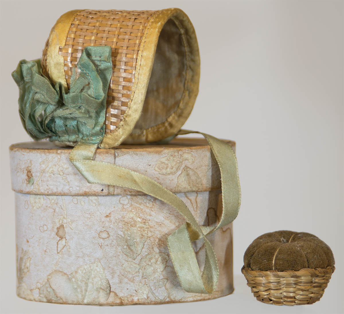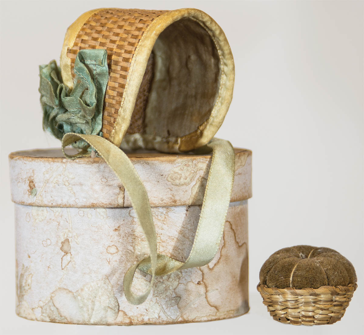 Oval wallpaper box, with fitted lid, poplar doll’s ware bonnet, lined in soft gray silk, green silk ribbon, 1 3/4″ h, 2″ l; and a woven sweetgrass and splint basket, with inset tomato pincushion, 1″ h, 1 1/4″ dia.