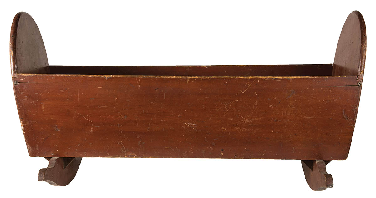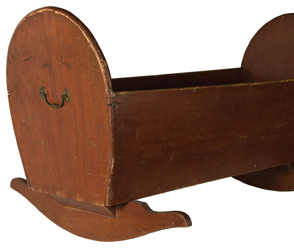 Pine, original red painted finish, two brass carrying handles, ends rounded, Watervliet or New Lebanon, NY, 22″ overall h, 41 1/2″ l, 23″ w (at rockers), 13 3/4″ w (inside).