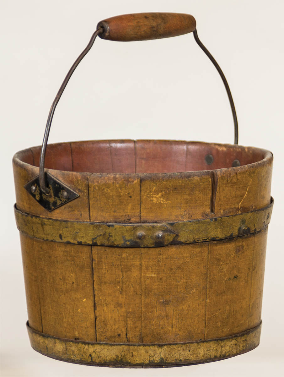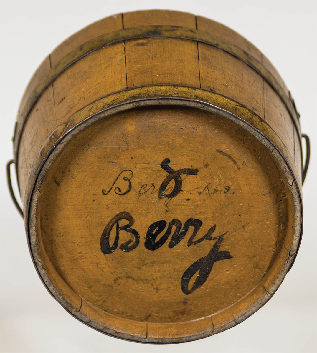 Pine, original red painted interior and yellow exterior, diamond shaped bail plates, two steel bands with pointed ends, signed twice on bottom in black “Berry” and “No. 9″, purchased at the Jordan Auction, Concord, NH, 9/27/68, (Kitty Haas collection), 6″ h, 8” dia.