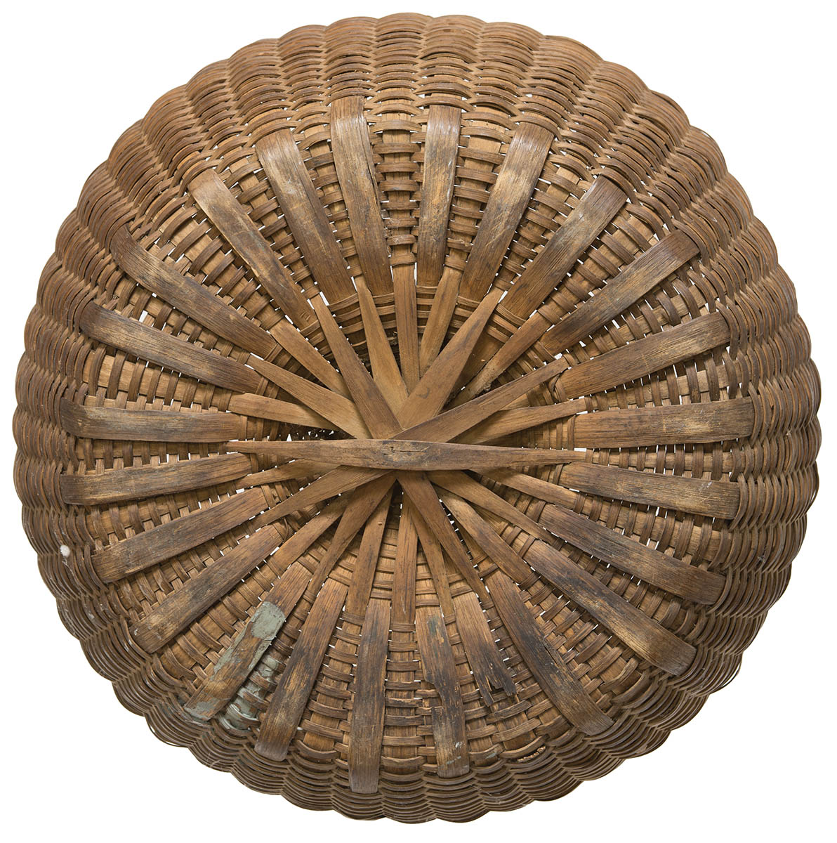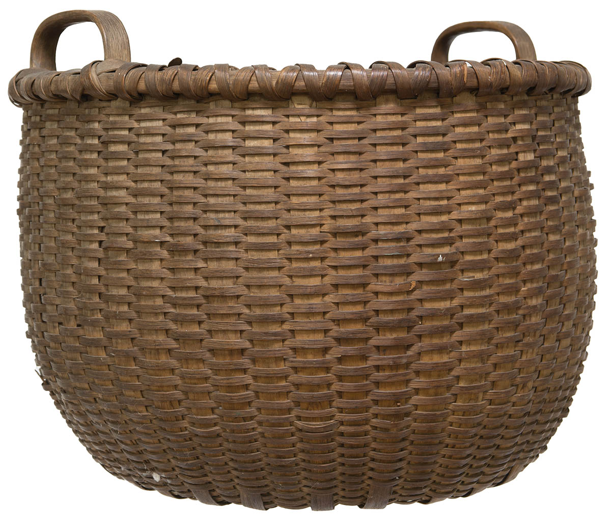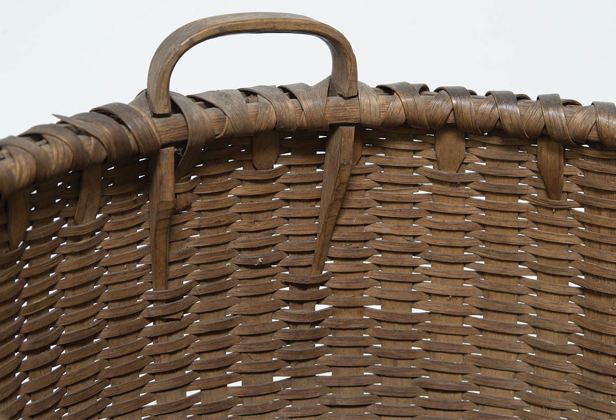 Black ash splint, finely carved inset double handles, double wrapped rim, original splint, reinforced bottom, excellent patina and condition, c. 1860-1880, 14″ h (to top of handle), 17 1/2″ dia.