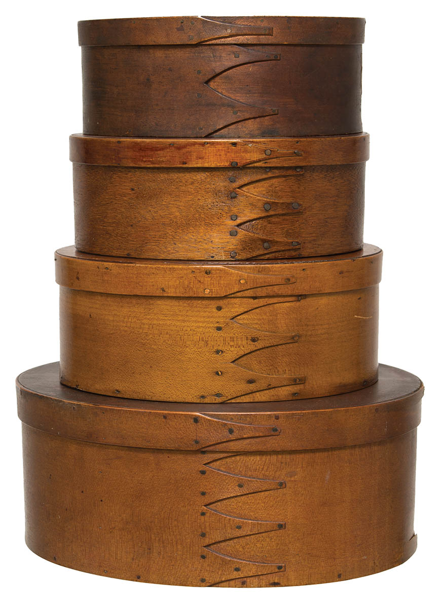 Maple and pine, original dark walnut stain, three fingers, decal on the side “1”, 3 1/2″ h, 8 3/4″ l; Tiger birch and pine, original red stained varnish finish, four fingers, 3 1/2″ h, 9 1/8″ l; Maple and pine, light varnish finish, (dark walnut stain at bottom rear, otherwise good), 4 1/8″ h, 10 1/8″ l; Maple and pine, original light brown stain, five fingers, small repairs on right side, large good size, 5 3/8″ h, 12 3/4″ l.