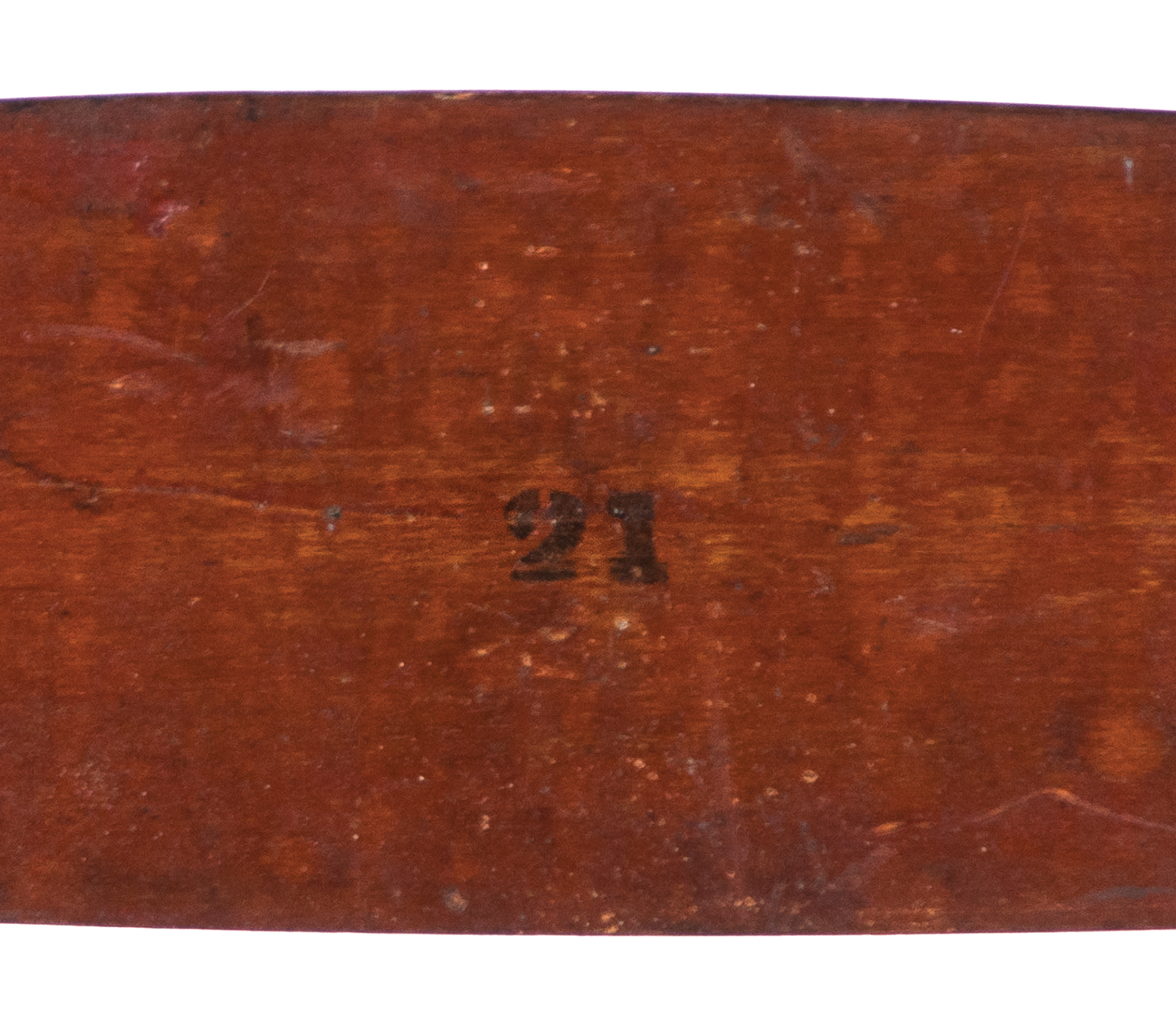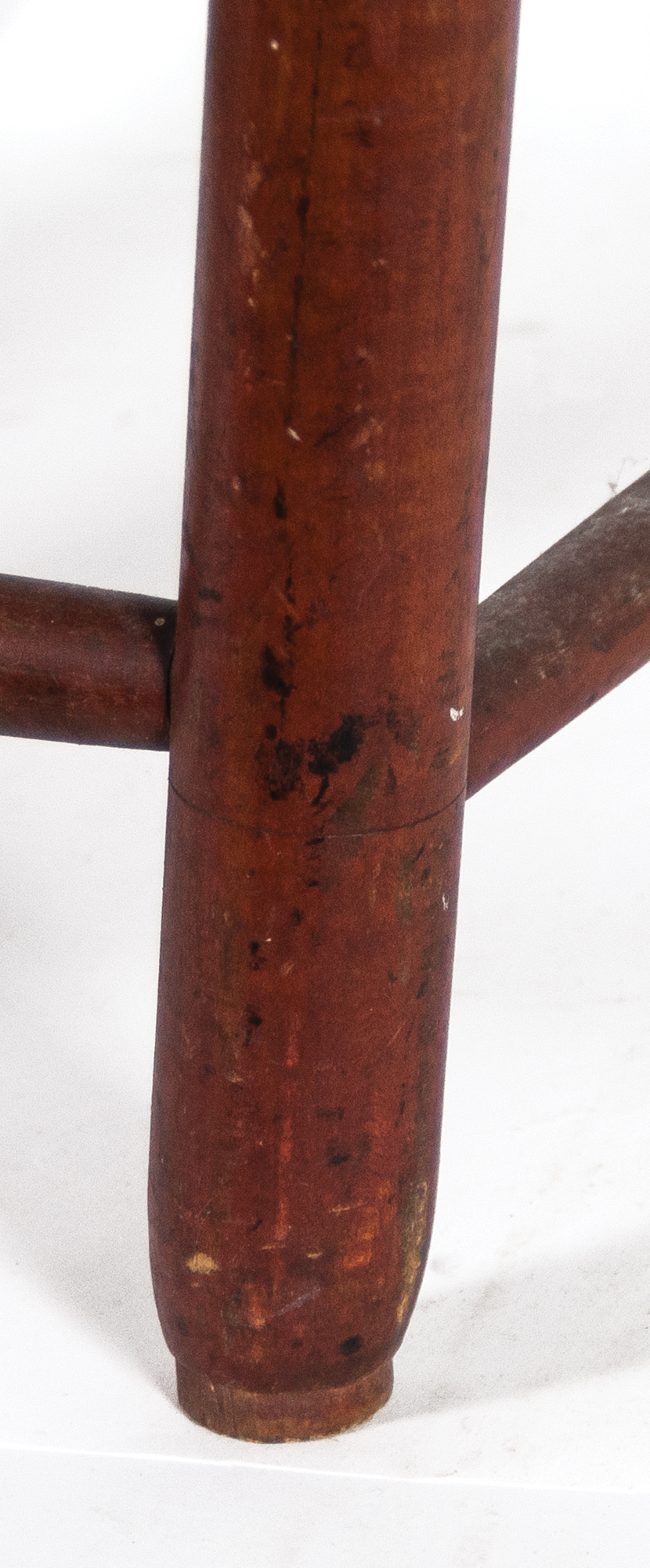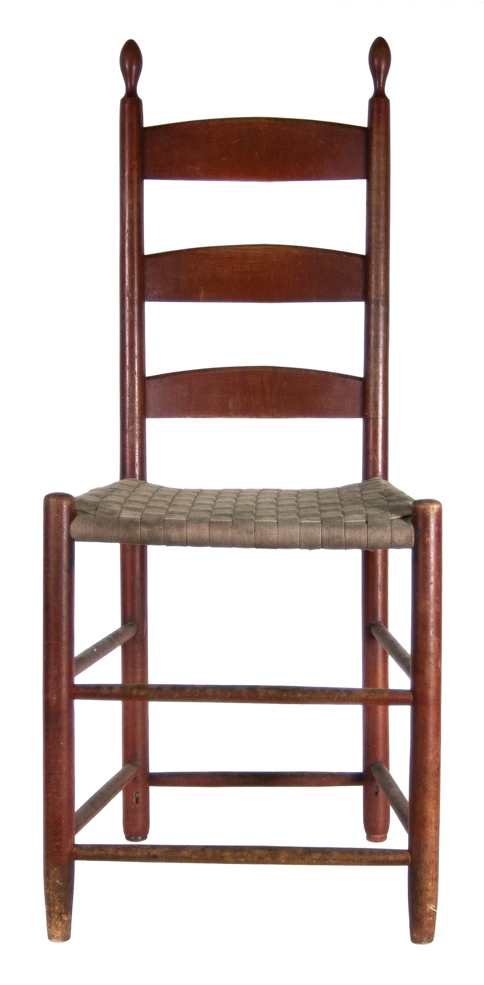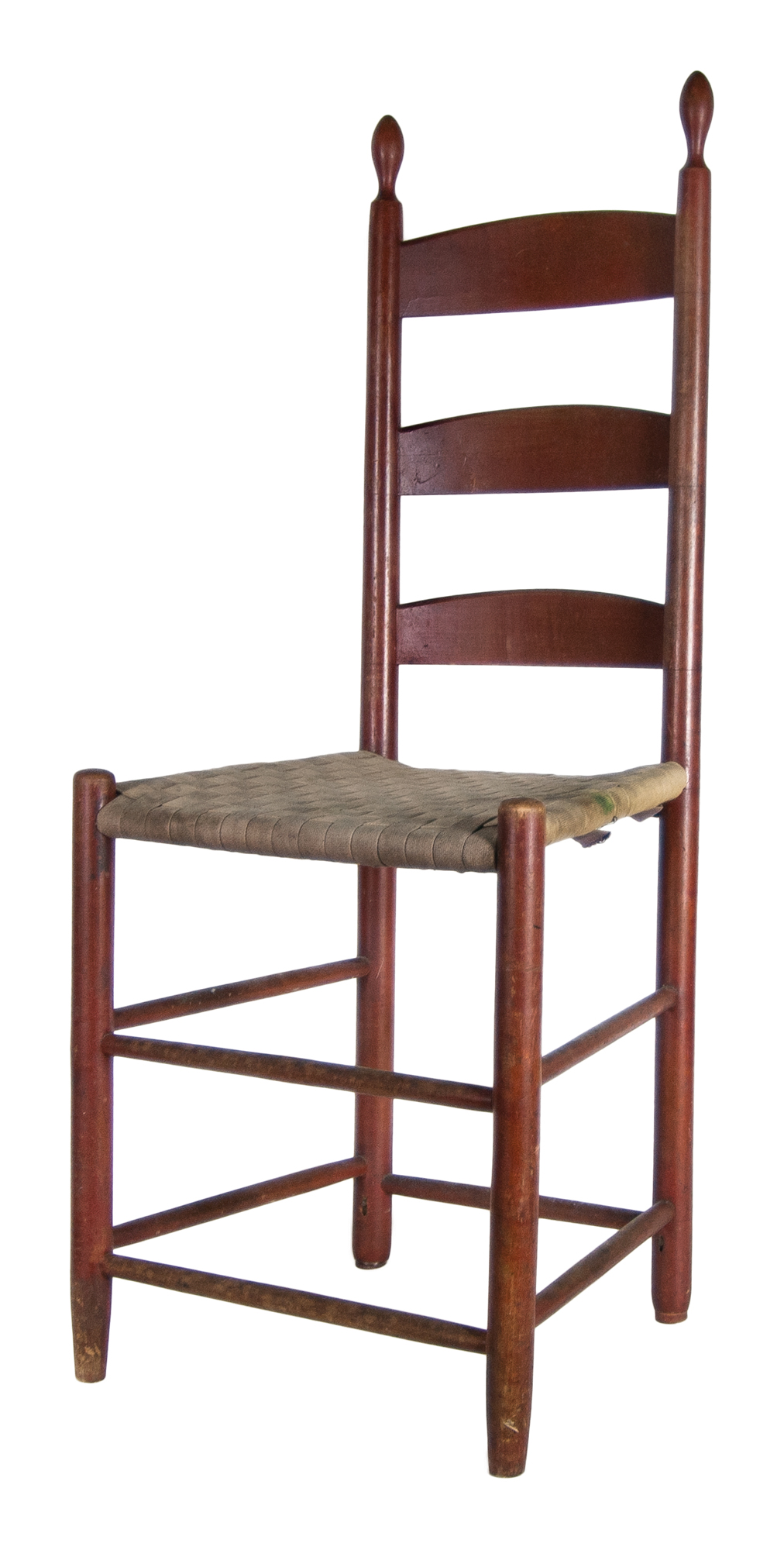 Maple and tiger maple, original bittersweet red painted finish, flame shaped finials, three graduated and beveled slats, purple, gray and beige tape seat (faded), the Retiring Room number “21” is stenciled in black on back of second slat, original tilters, Harvard, MA, c. 1840, 19″ seat h, 40 1/2″ overall h.