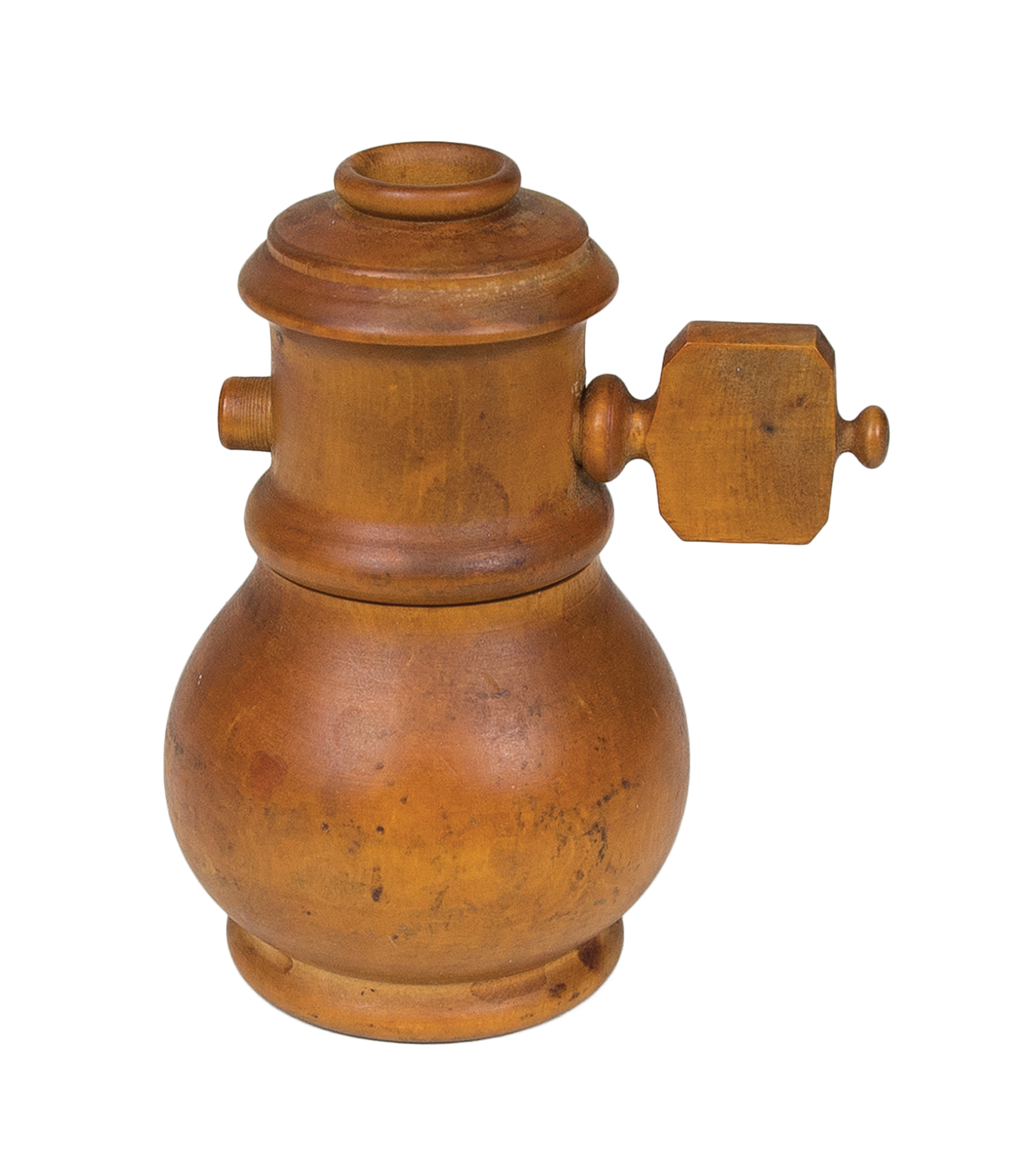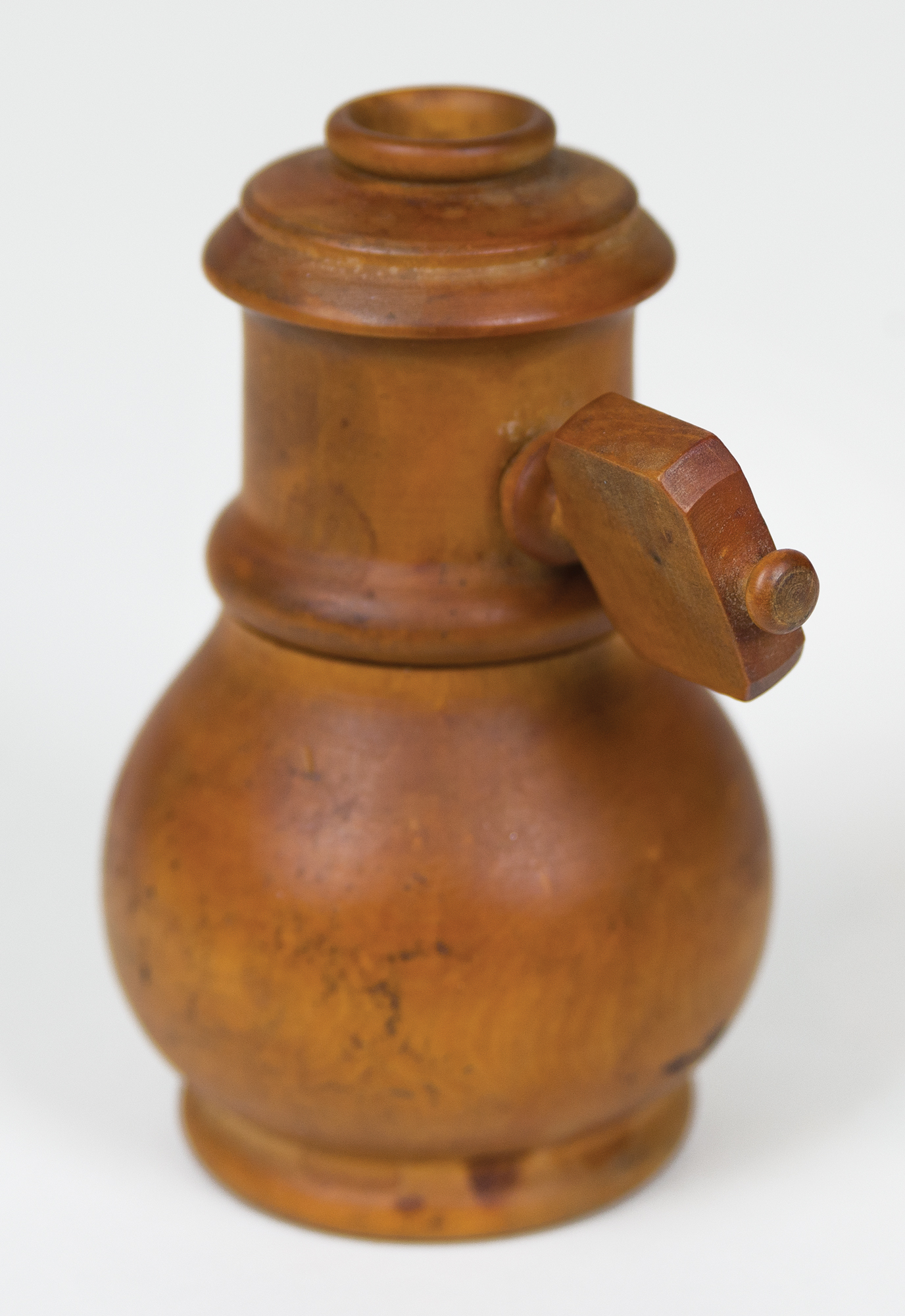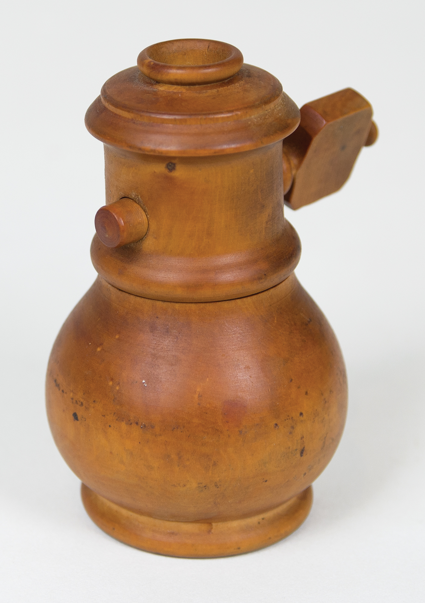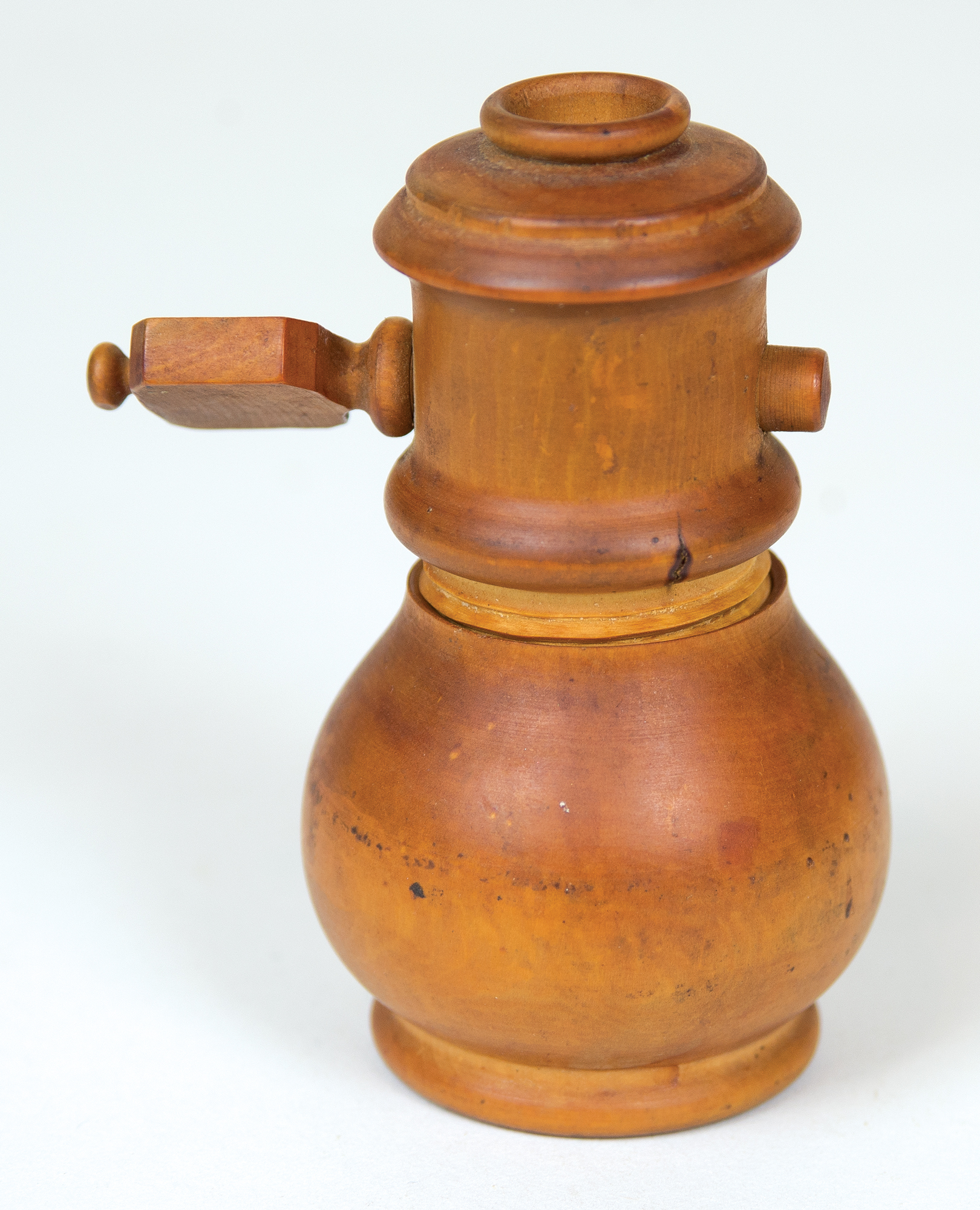 Maple, original light ochre stained finish with patina, exceptional turned handle with interior grooved grinding ball, two-piece footed bulbous base threaded to accept the mechanical top section, c. 1850, (note: an ingenious Shaker constructed grinder, possibly used for peppercorns, nutmeg, etc.; the shaped and turned handle is true Shaker master work), 3 3/4″ h, 2 1/4″ dia.