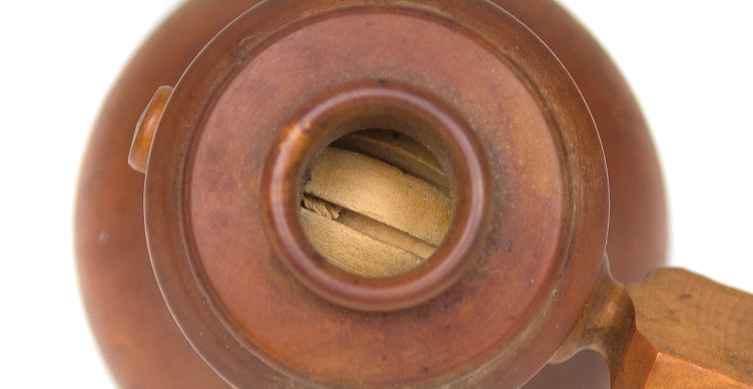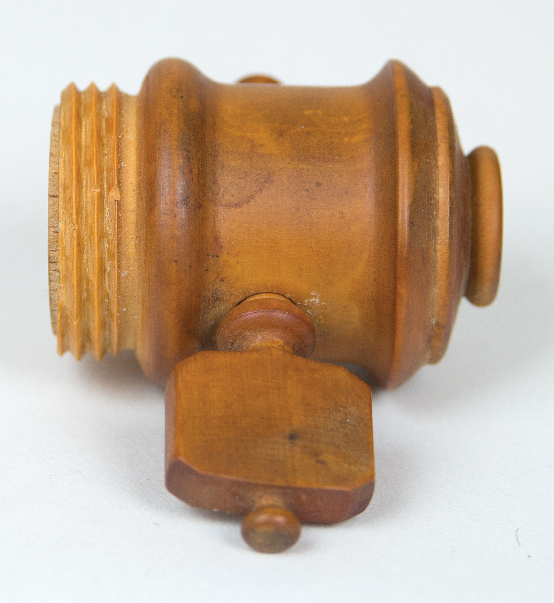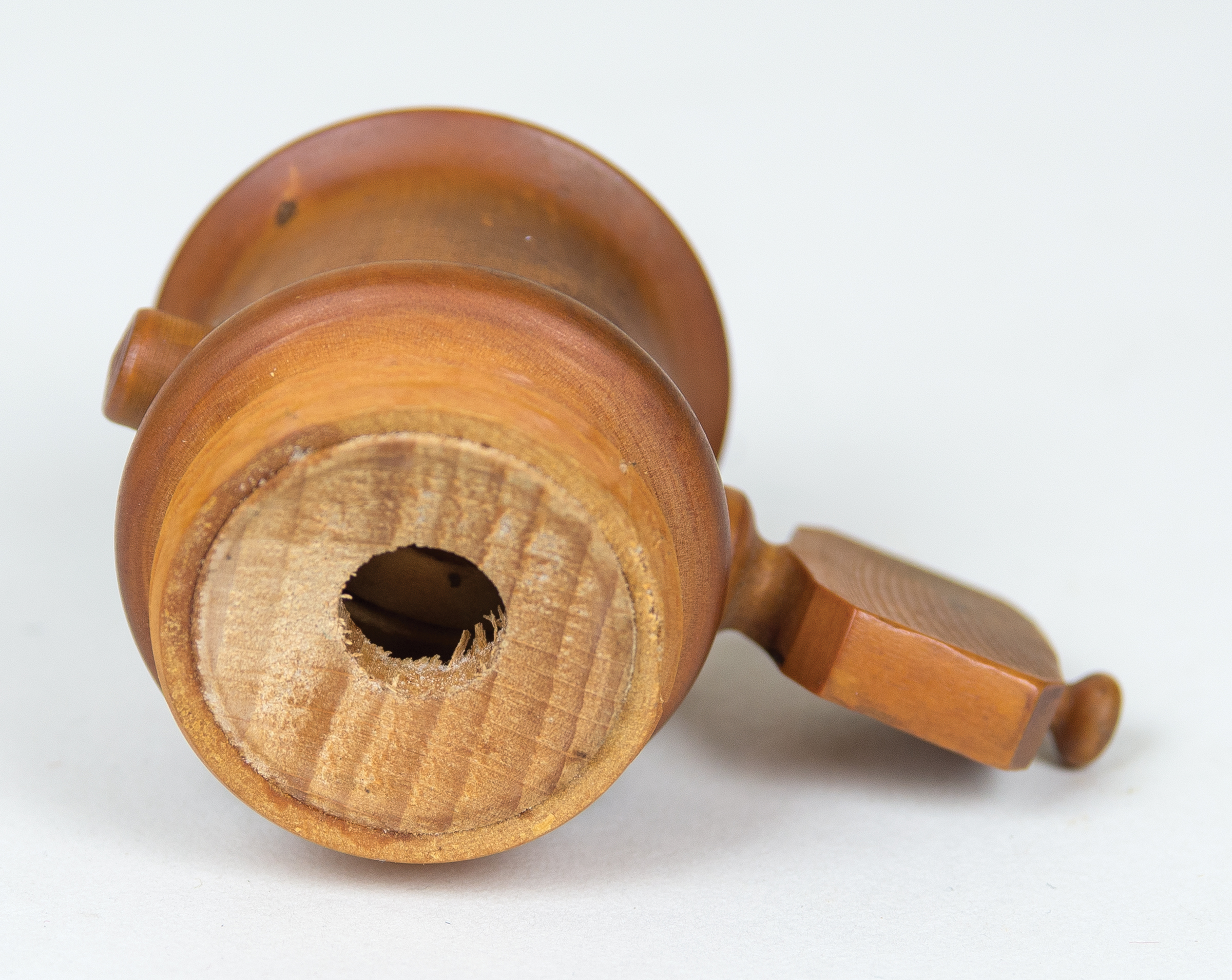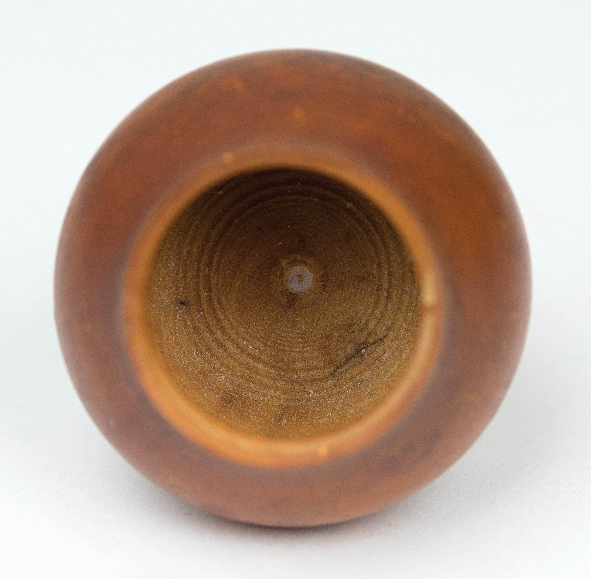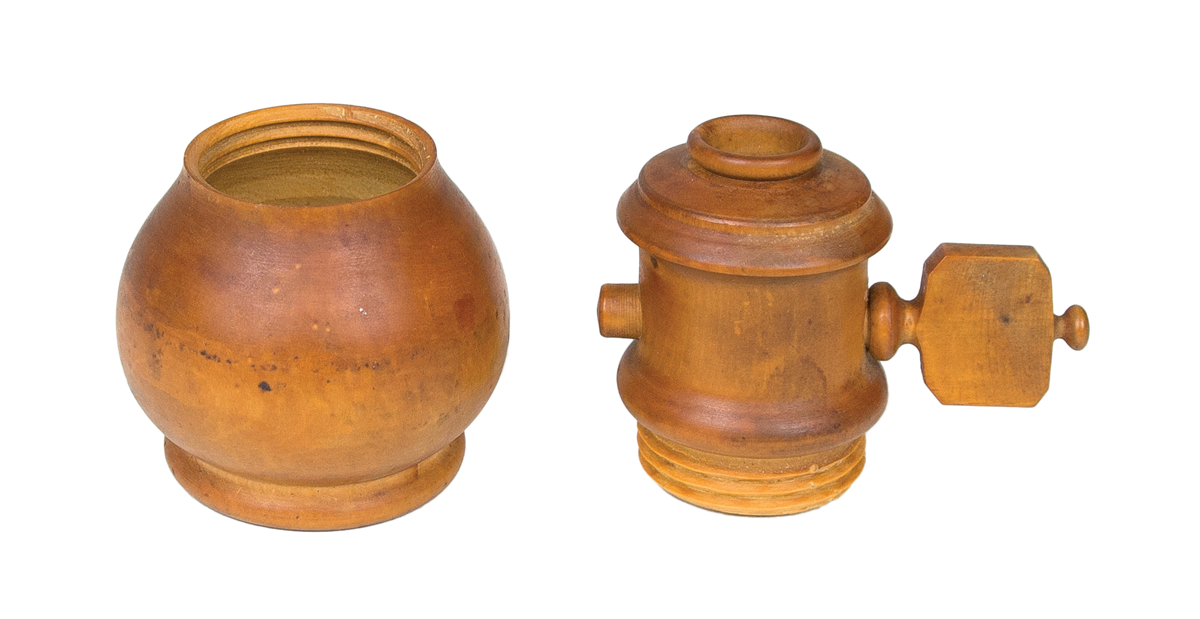 Maple, original light ochre stained finish with patina, exceptional turned handle with interior grooved grinding ball, two-piece footed bulbous base threaded to accept the mechanical top section, c. 1850, (note: an ingenious Shaker constructed grinder, possibly used for peppercorns, nutmeg, etc.; the shaped and turned handle is true Shaker master work), 3 3/4″ h, 2 1/4″ dia.