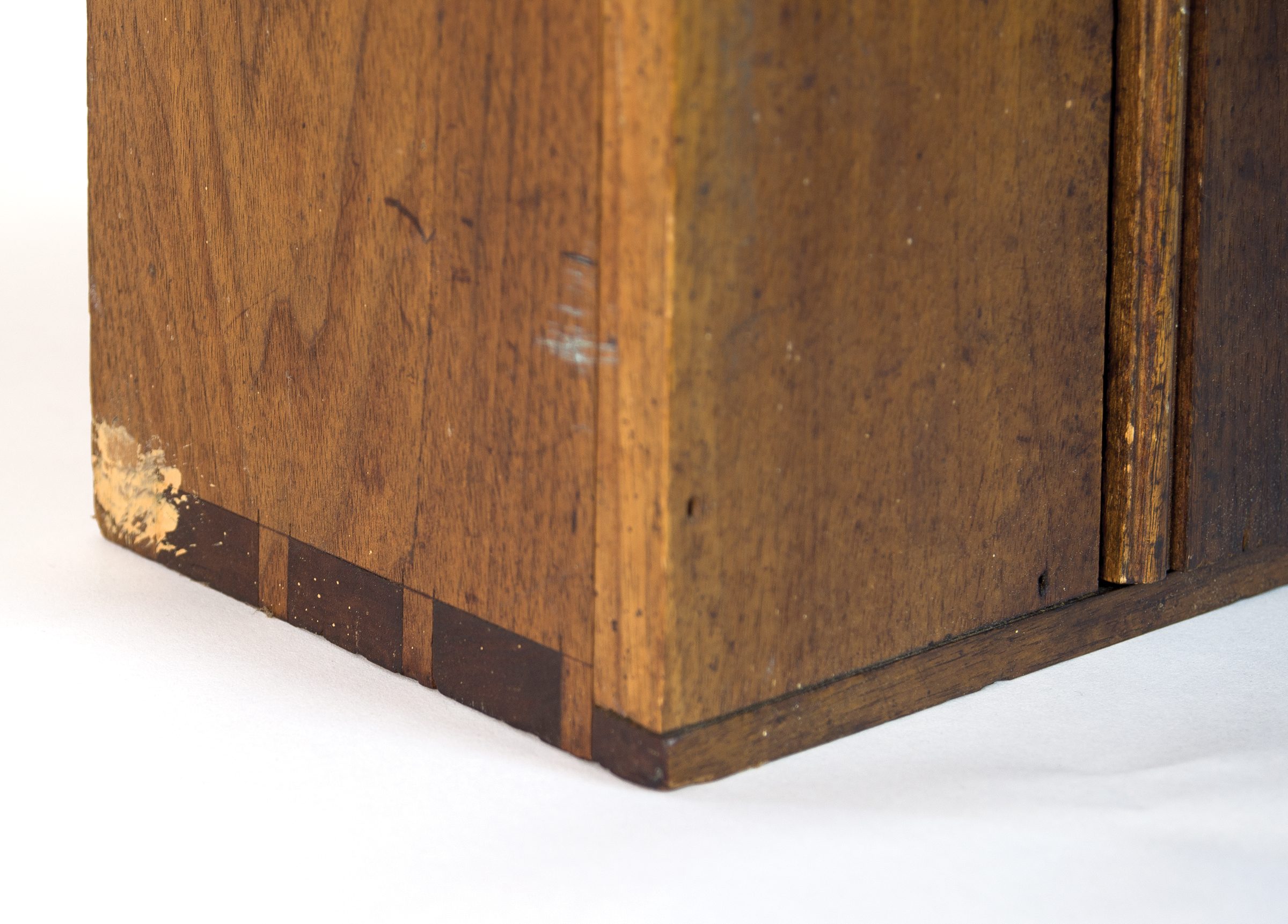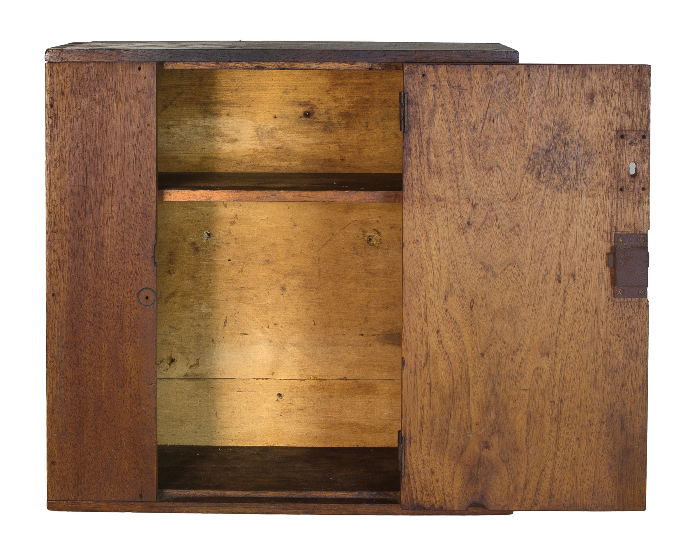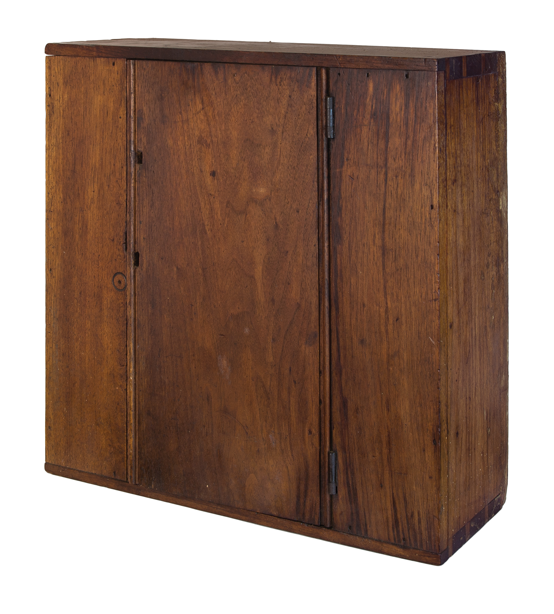 Butternut and pine, original light brown stained finish, dovetailed case, double hinged single door, with half-round bead on left and right, lock in middle, left hand side panel in front left is an old Shaker replacement, Canterbury, NH, c. 1840-1860, 18″ h, 18″ w, 6 3/8″ d.