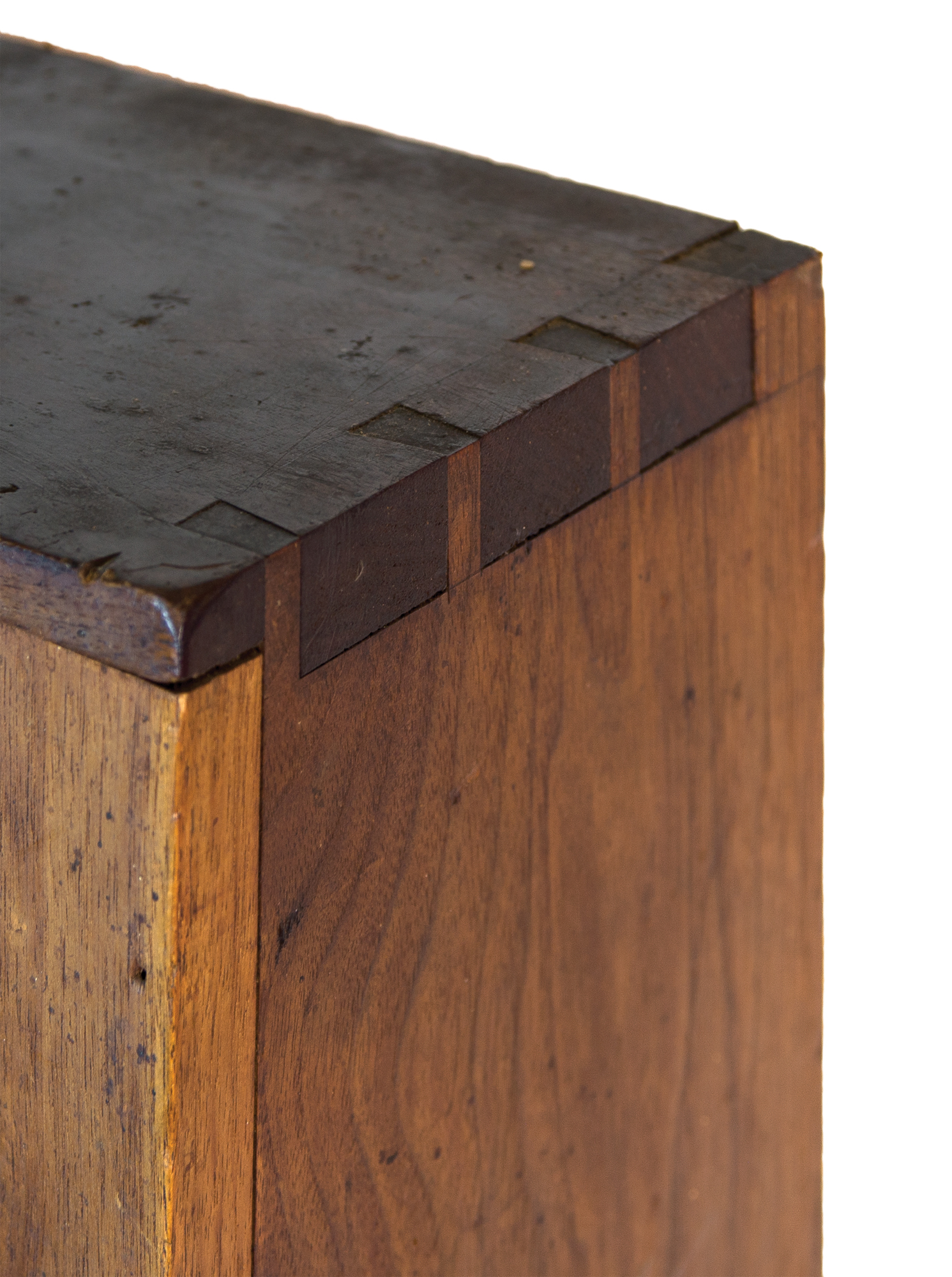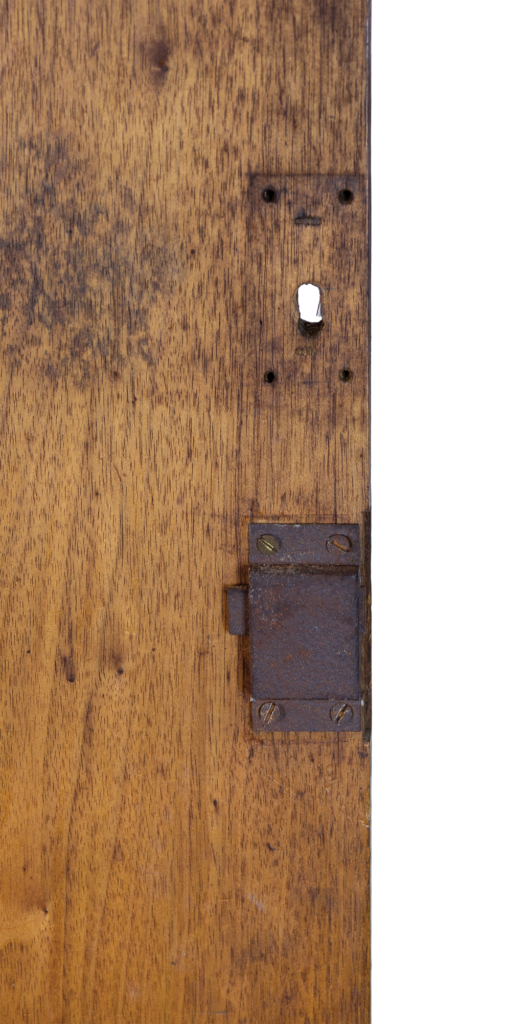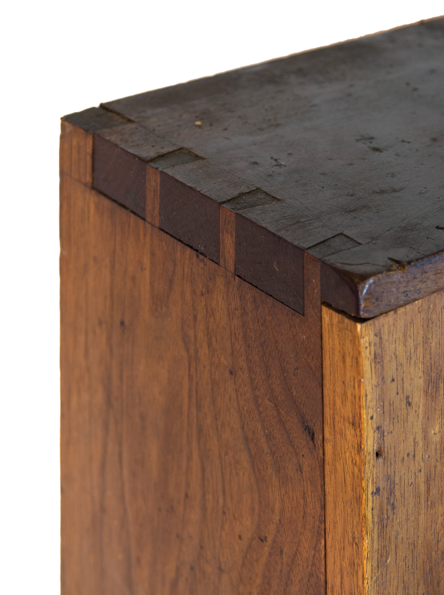 Butternut and pine, original light brown stained finish, dovetailed case, double hinged single door, with half-round bead on left and right, lock in middle, left hand side panel in front left is an old Shaker replacement, Canterbury, NH, c. 1840-1860, 18″ h, 18″ w, 6 3/8″ d.